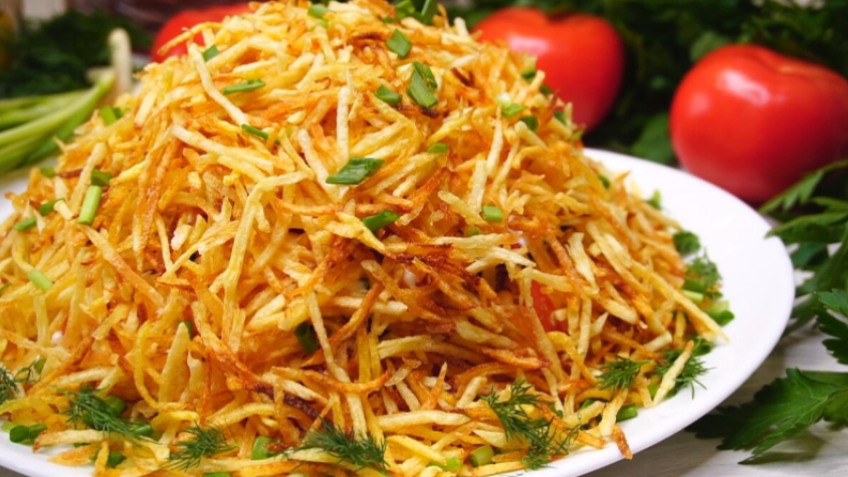 Приготовление начинается с подготовки картофеля. Два клубня нужно натереть на терке для корейской моркови, тщательно промыть в холодной воде и обсушить бумажными полотенцами. Далее, на сковороде раскалить растительное масло и обжарить натертый картофель до золотистого цвета.