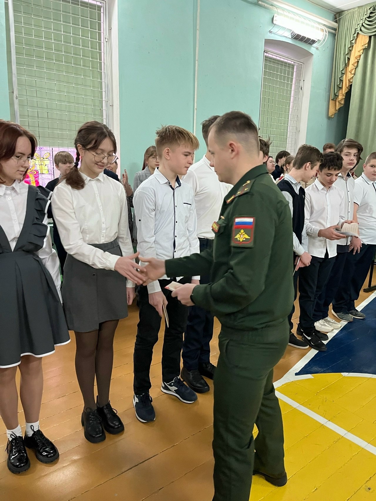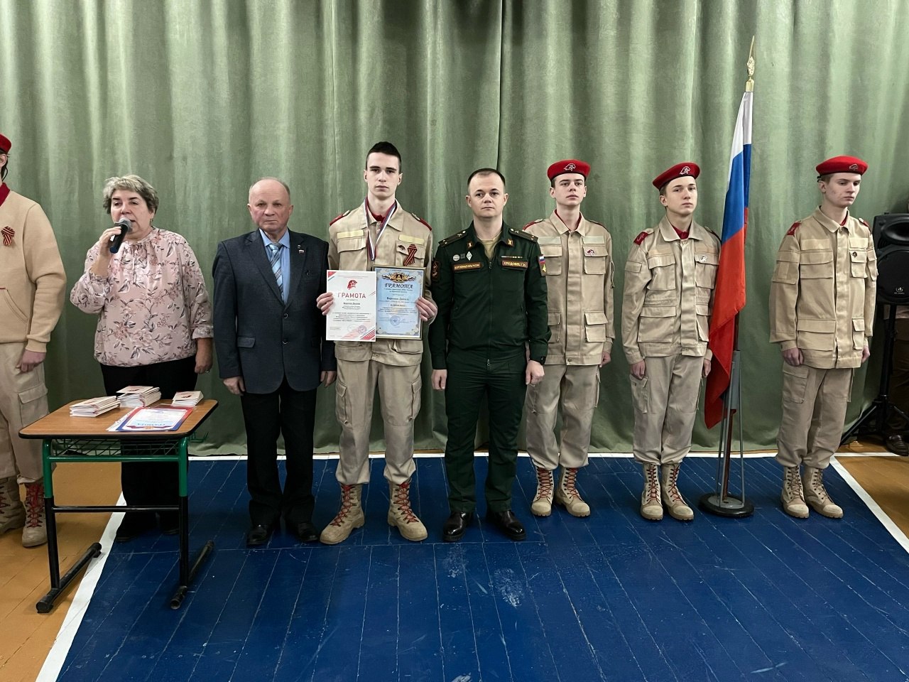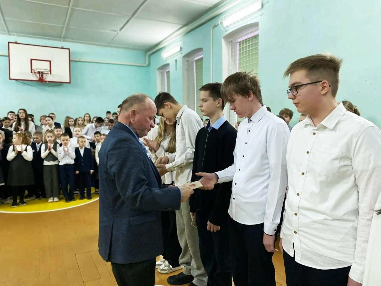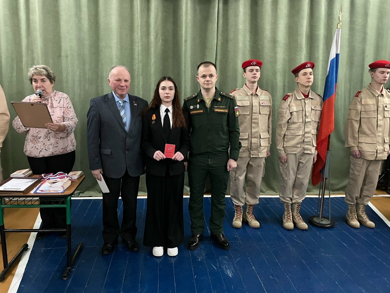 На линейке в школе присутствовал участник СВО, ветеран боевых действий Геннадий Николаевич Сподобец. Он вручил Знак юнармейской доблести активному члену школьного юнармейского отряда Виктории Володченко и поздравил ребят с открытием Месячника.