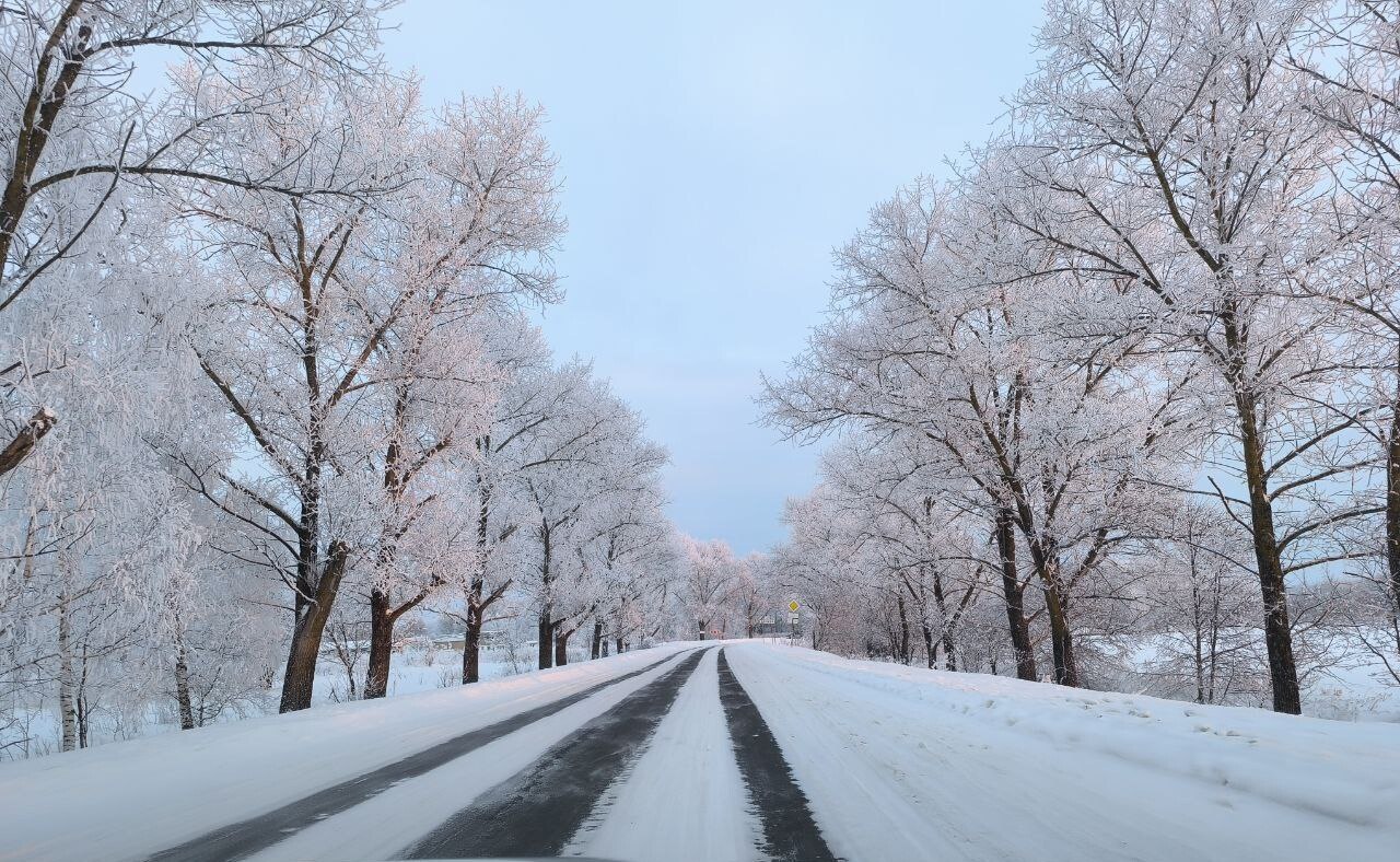 Зима превращает обычный путь в волшебное путешествие, где каждый поворот дарит новый заснеженный пейзаж, а дорога становится тропой между застывшими в безмолвии деревьями, будто охраняющими покой зимнего царства.