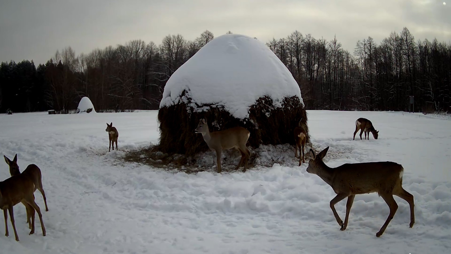 Сотрудники заповедника "Брянский лес" опубликовали редкие кадры оленей, выходящих к стогам сена, специально подготовленным для зимней подкорки животных.