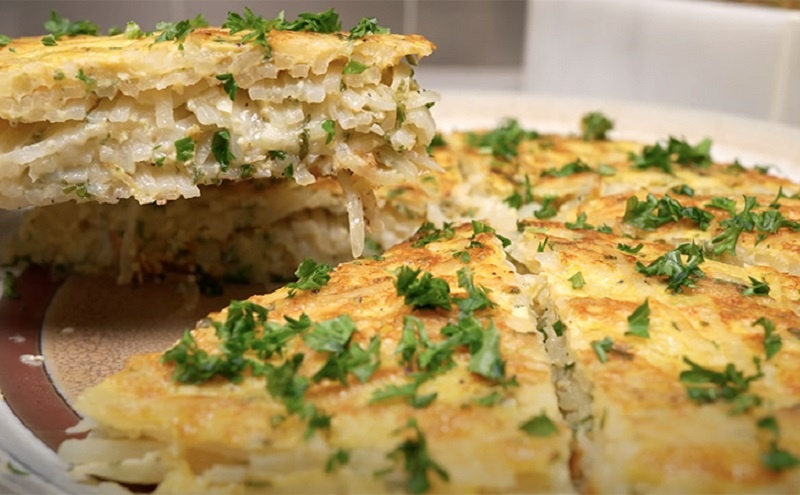 Картофель натирают или нарезают мелкой соломкой, затем смешивают с яичной смесью, специями и зеленью. На разогретой сковороде уложите первую порцию массы, сверху — сыр, накройте оставшейся массой и обжаривайте до золотистой корочки. Финальный шаг — переворот и еще немного тепла, чтобы сыр расплавился и закрепил корочку.