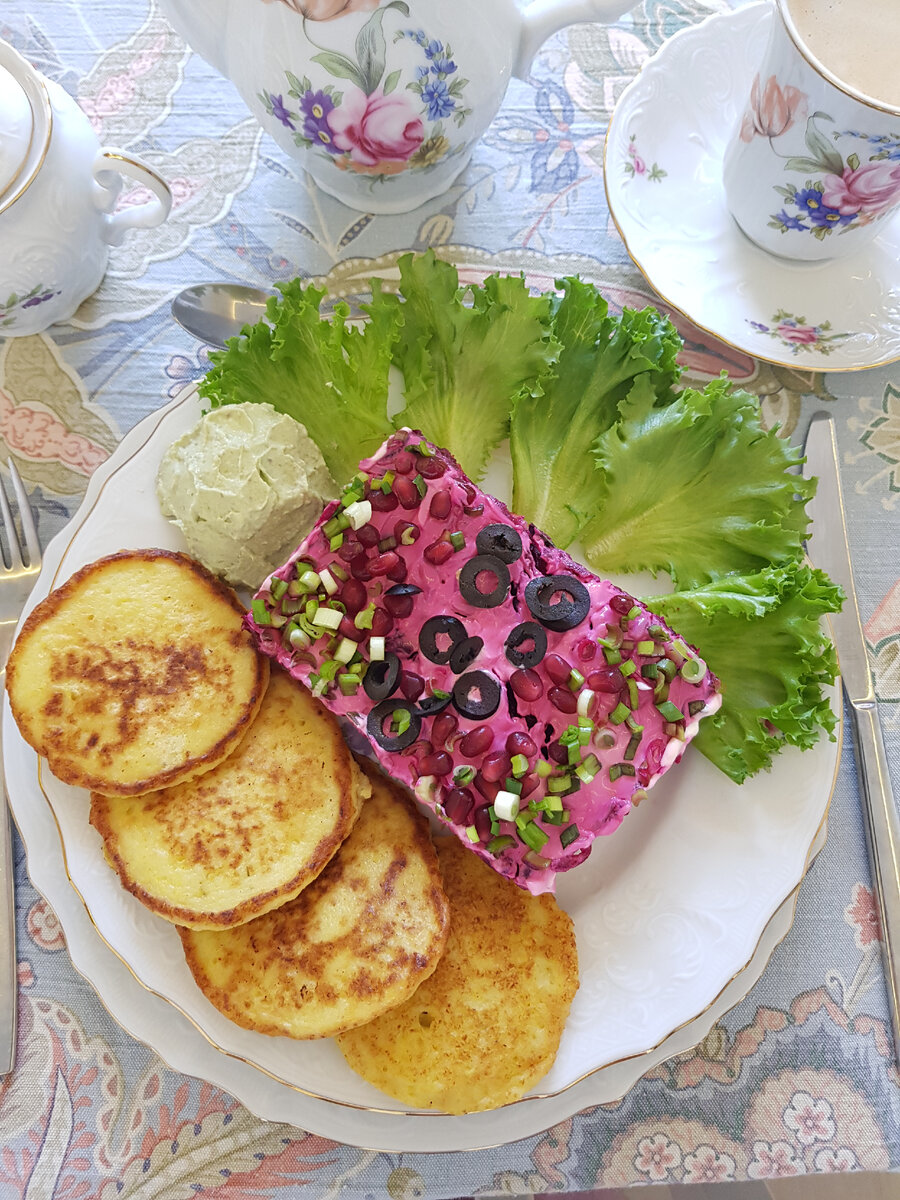 Пока салат охладится, можно приготовить картофельные оладьи. Они получаются гладкими и воздушными, если тщательно вымешать тесто и обжарить на умеренном огне. Листья салата будут служить подложкой, а нерка под шубой станет ярким акцентом блюда.