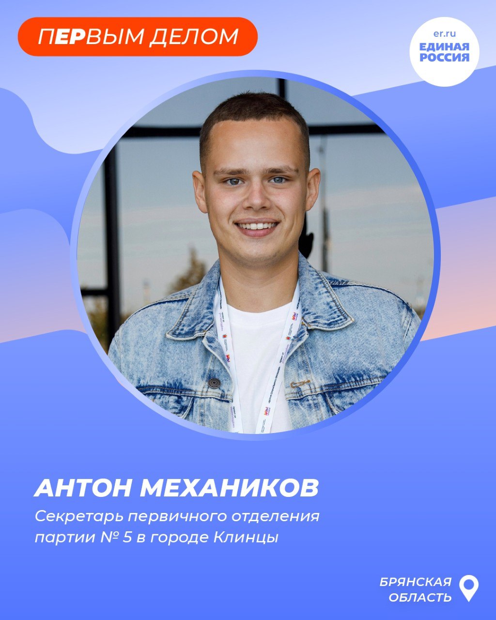 Новым героем рубрики «пЕРвым делом», в которой мы знакомим подписчиков с руководителями первичек Единой России в регионах, стал Антон Механиков из Брянской области. Помимо общественной работы в партии в регионе, он участвовал в гуманитарной миссии партии в Донбассе.