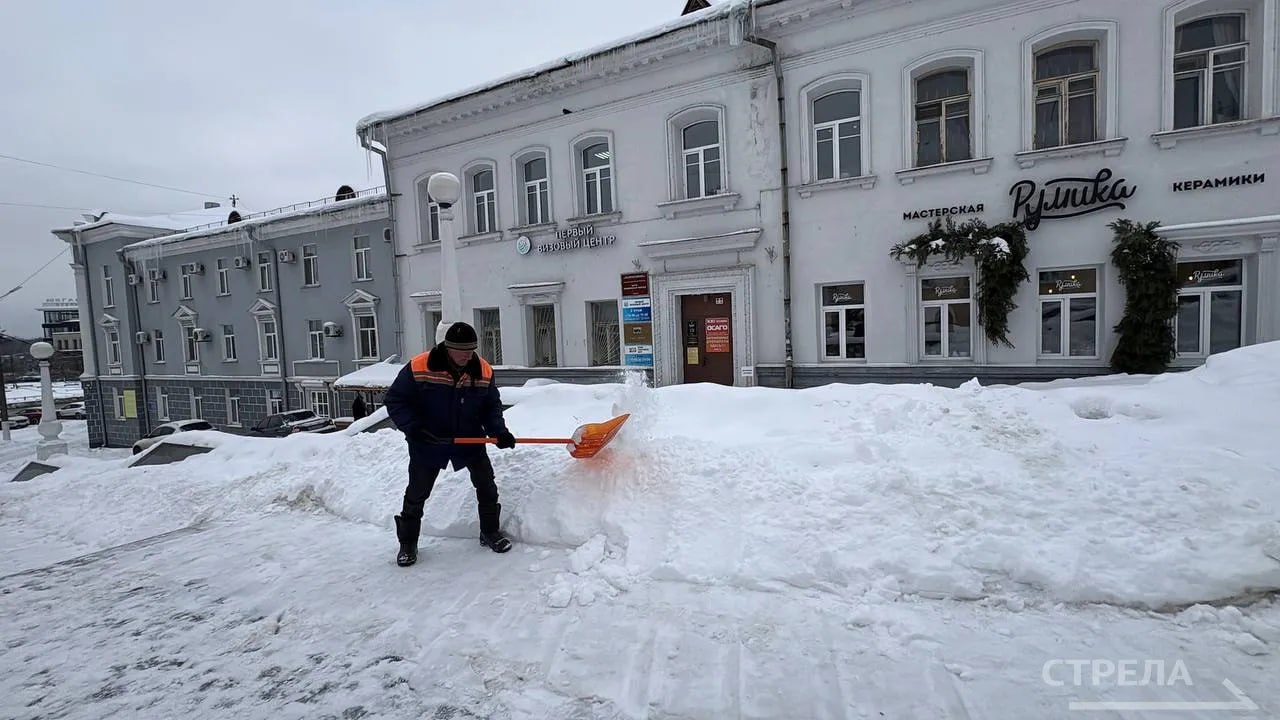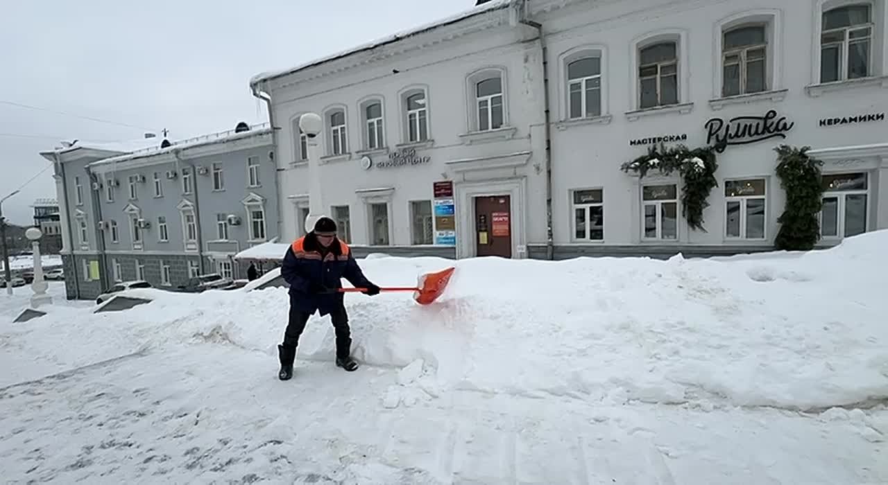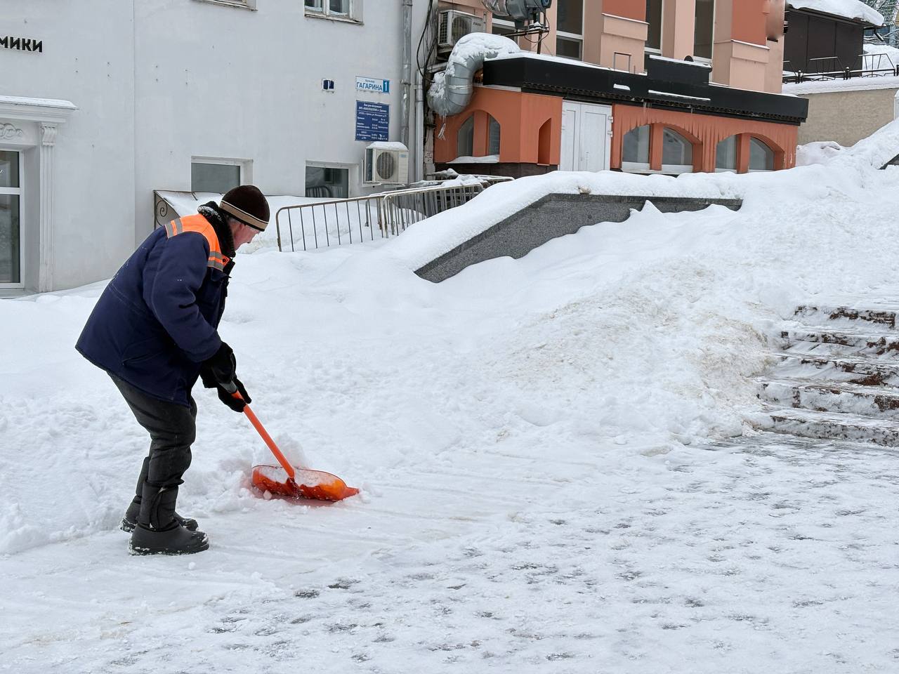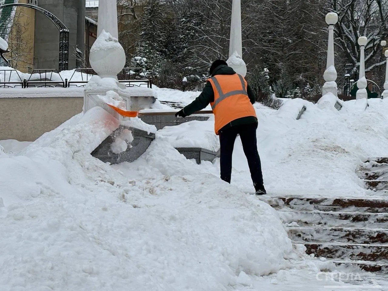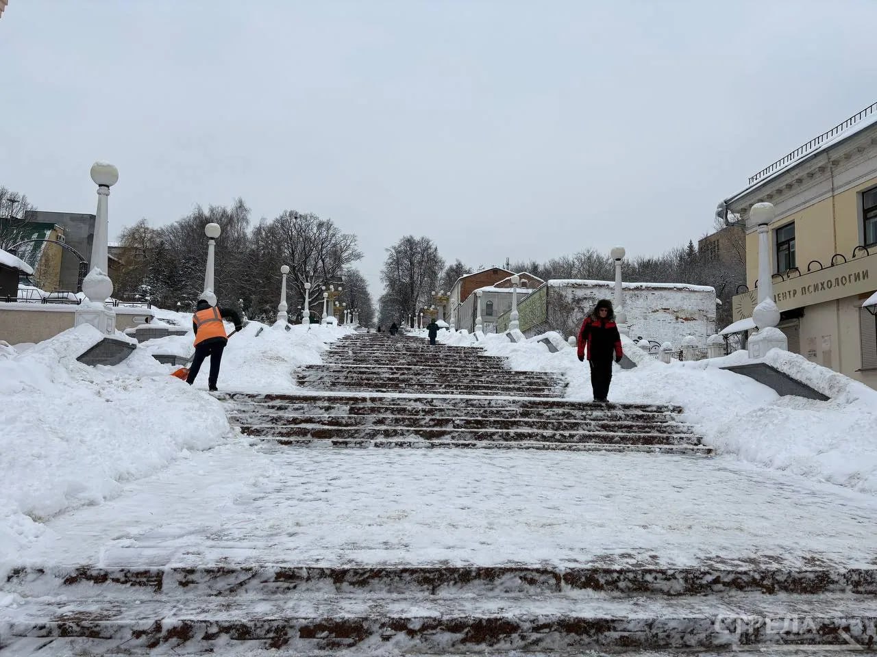 Там, где не может проехать техника, снег убирают специалисты дорожных и коммунальных служб. Например, рабочие трудятся на Набережной, очищая ступени лестницы. Несколько специалистов активно орудуют лопатами, создавая безопасные условия для спуска и подъема.