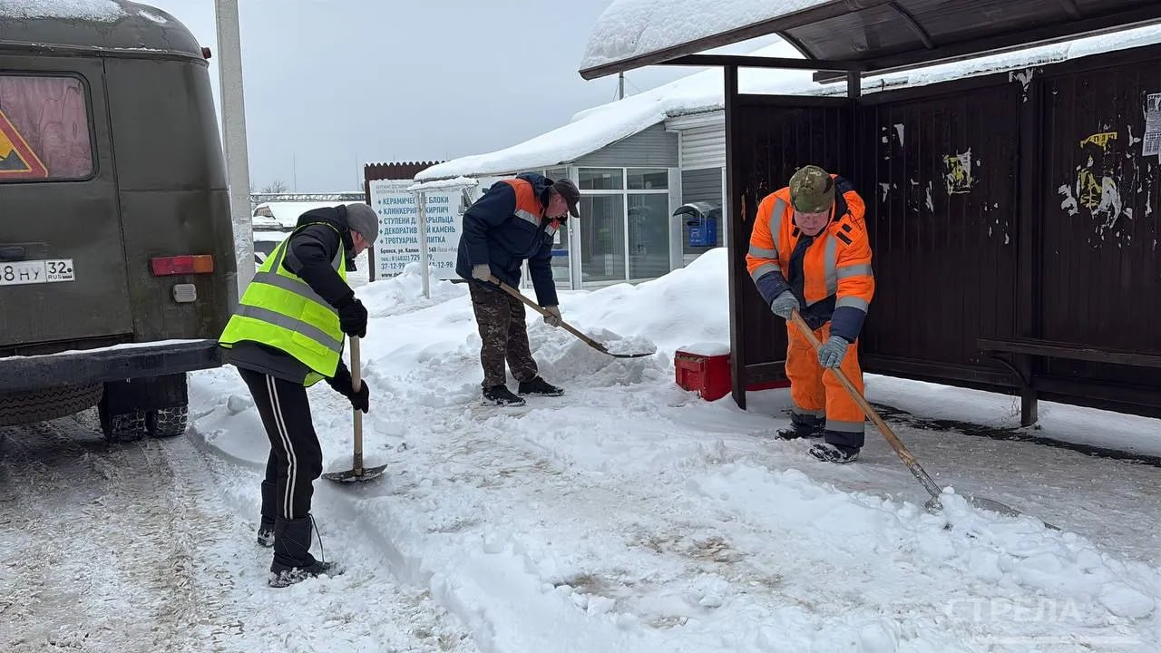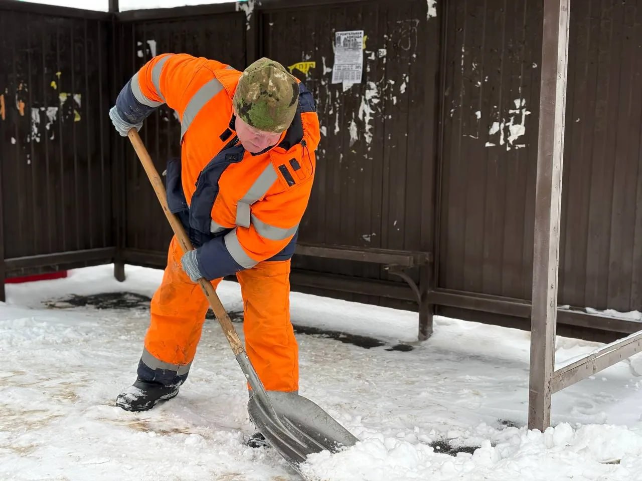 Бригады рабочих замечены и на Калинина. Они счищают снег не только с дорог и тротуаров, остановок, но и сметают снежные наносы с крыш остановочных павильонов.
