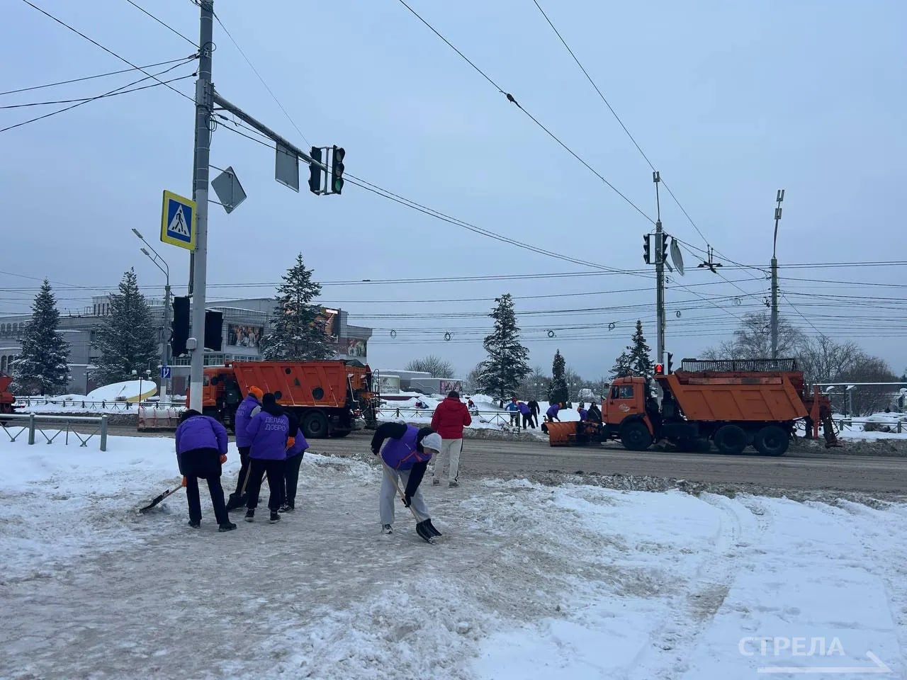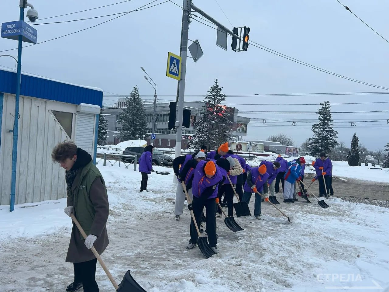 Ребята вышли в помощь службам города Брянска. Они расчищают подходы к пешеходным переходам, убирают снег после проезда техники.