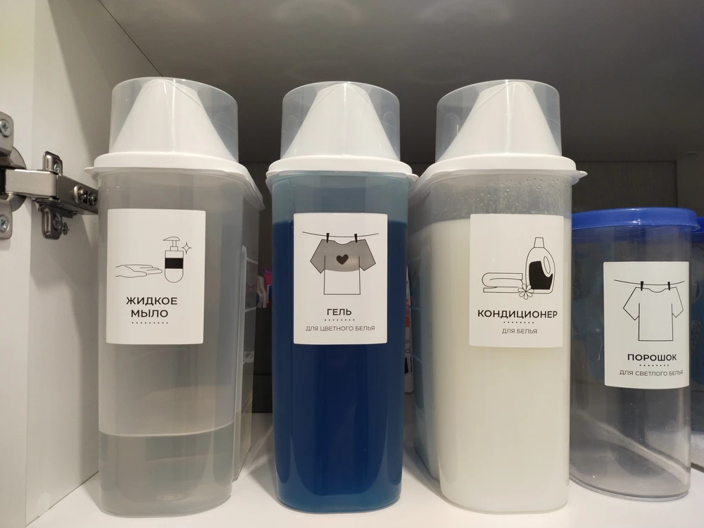 Многие уже знают, что, покупая средства для стирки или мытья посуды в больших канистрах, можно сэкономить. Однако их использование может быть неудобным. Специальные контейнеры с наклейками оказались решением этой проблемы. С помощью таких ёмкостей можно не только удобно хранить жидкости, но и организовать пространство на кухне. За 557 рублей можно получить три контейнера объемом 2200 мл, подходящих для хранения всего, от жидкого мыла до порошков.