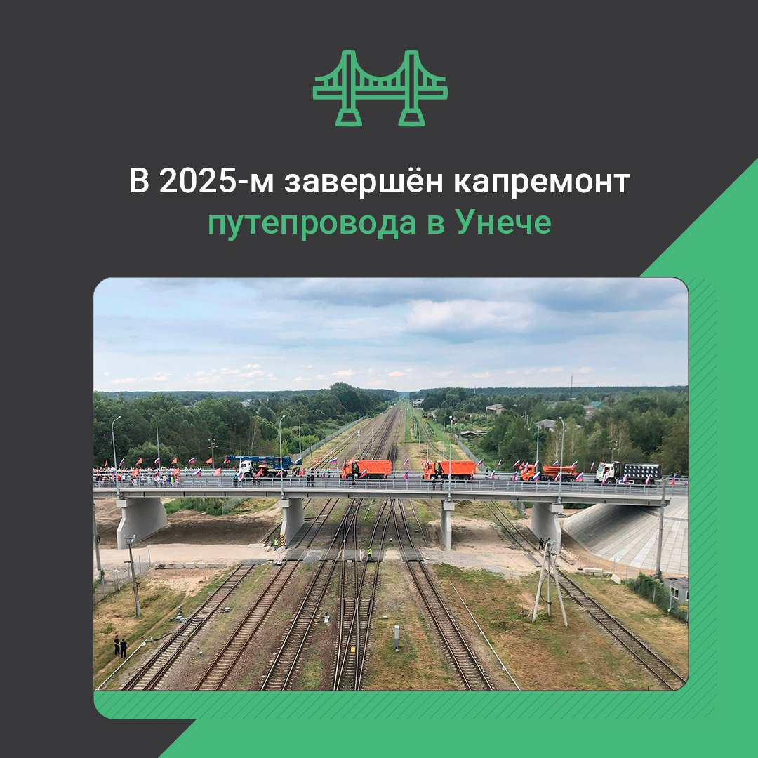 Одним из ключевых объектов, реализованных по национальному проекту «Инфраструктура для жизни» в Брянской области в 2025 году, стал путепровод через железнодорожные пути в городе Унеча. В минувшем году завершился его капитальный ремонт. Этот важный объект протяженностью 134,4 пог. м. фактически построен заново благодаря нацпроекту. Сооружение не ремонтировалось длительное время, ранее его состояние вызывало у автомобилистов справедливые нарекания. Теперь он соответствует всем современным требованиям и стандартам. Кроме того, стал безопаснее для всех участников дорожного движения: в процессе капитального ремонта здесь установили освещение и обустроили тротуары. Путепровод обеспечивает сообщение Унечи с федеральной трассой, соседними районами, а также с областным центром.