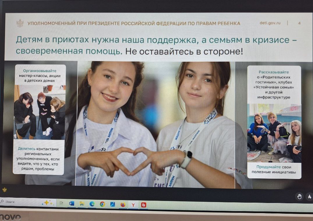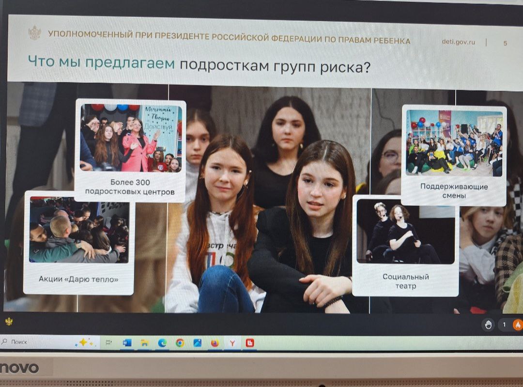 Мария Алексеевна просила ребят вместе с уполномоченными активно подключаться к оказанию помощи детям, состоящим на профилактических учетах. В регионах открываются подростковые центры, куда ребята могут приходить, обсуждать проблемы и находить решение.