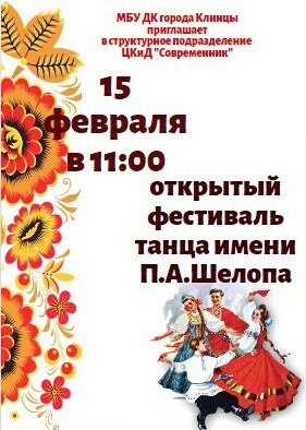 15 февраля, в структурном подразделении ЦКиД «Современник» пройдет открытый фестиваль танца имени Павла Андреевича Шелопа!