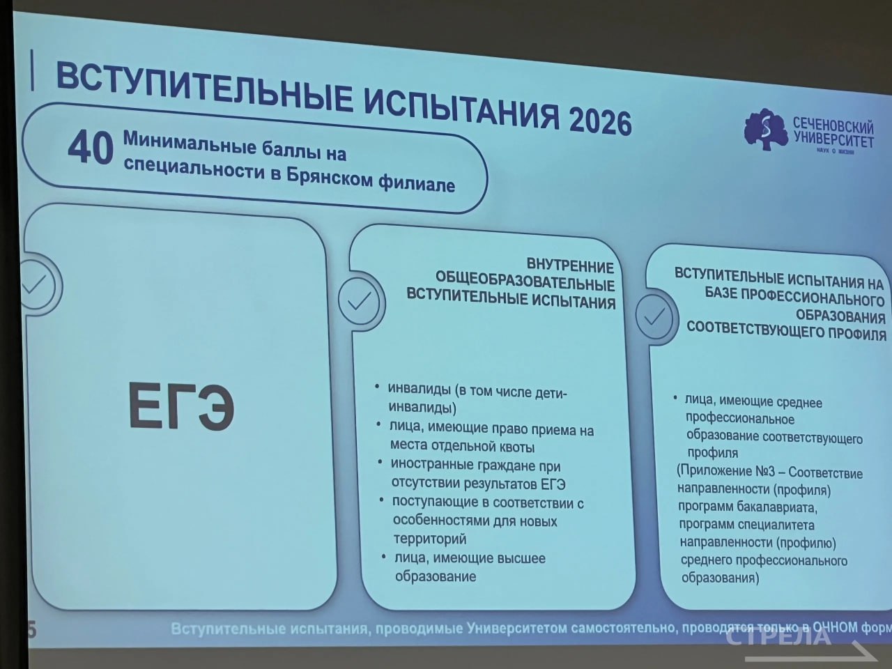 Татьяна Литвинова рассказала о порядке поступления в Брянский филиал Сеченовского университета по программам специалитета. Набор студентов будет вестись по программам «Лечебное дело», «Педиатрия», «Стоматология», «Фармация». Уже известны контрольные цифры приема. Отдельное внимание было уделено льготным условиям поступления, даны разъяснения о правилах обучения на целевом направлении. Кроме того, речь шла о вступительных испытаниях.