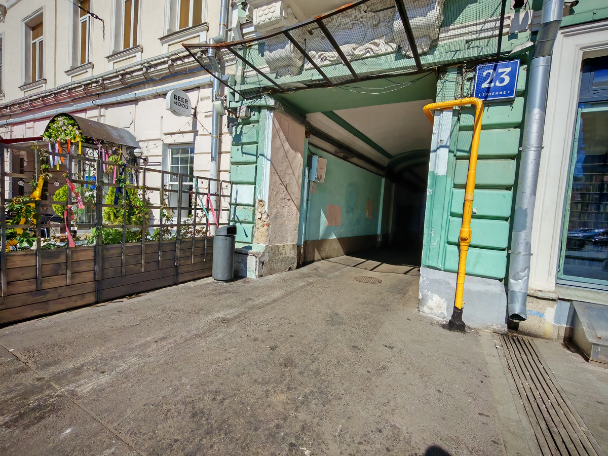 Заведение, скрывающееся в арке, вряд ли привлекло бы внимание, если бы не его уникальная концепция. Находится оно в довольно спокойном уголке с домами и деревьями, что делает его ещё более загадочным.