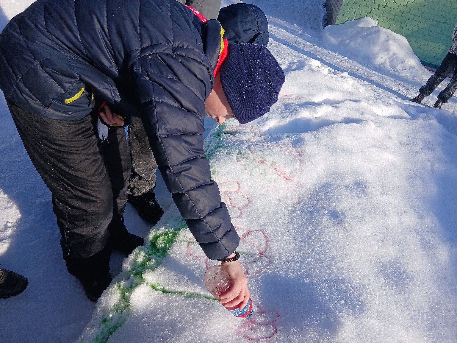Разделившись на две команды, ребята отправились в веселый и увлекательный мир, где смогли показать свою ловкость, быстроту и выносливость. Они с удовольствием участвовали в конкурсах «Снежная дорожка», «Ёлочки-пенечки», «Зимняя рыбалка», поиграли в «Хоккей» и «Биатлон». А в конце мероприятия с помощью разноцветный воды нарисовали на снегу настоящую цветочную клумбу.