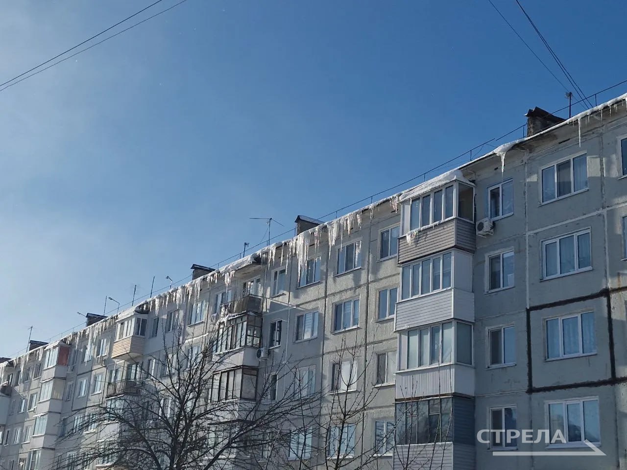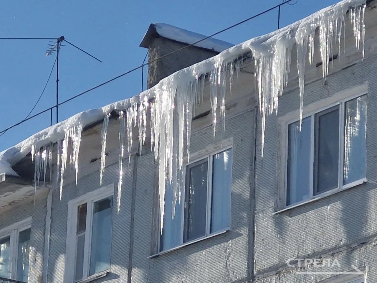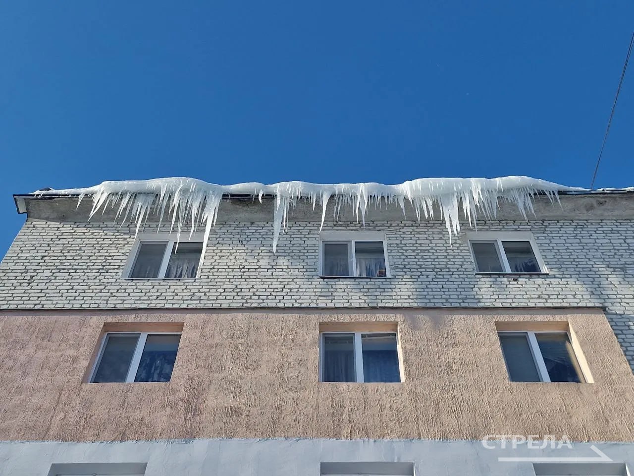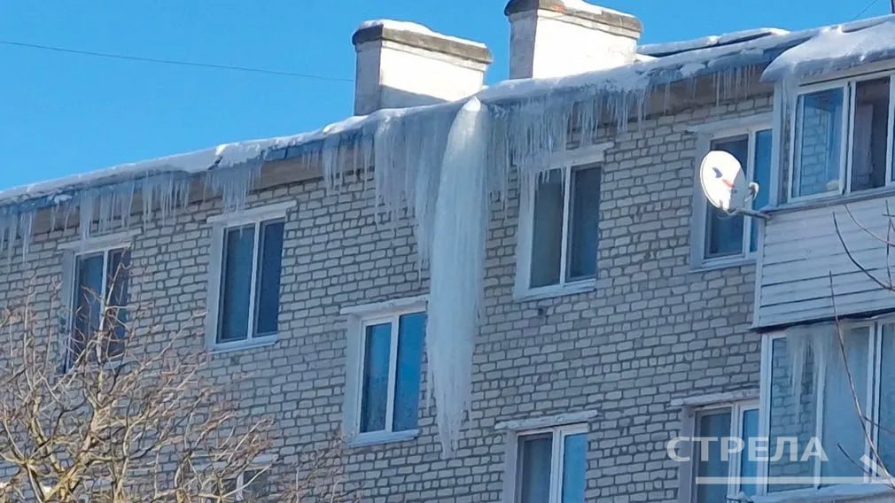 Брянцев предупредили о гигантских сосульках на многоэтажках в Шибенце. Огромные глыбы льда свисают с крыш домов №14, 15 и 37 на улице Карла Маркса.