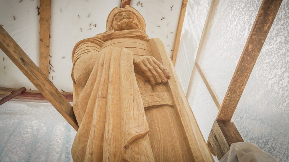 На центральной аллее парка появится новая скульптура князя Романа Брянского. К работам над деревянным монументом приступили еще в начале прошлой осени. Скульптор Андрей Вишневский практически завершил ее.