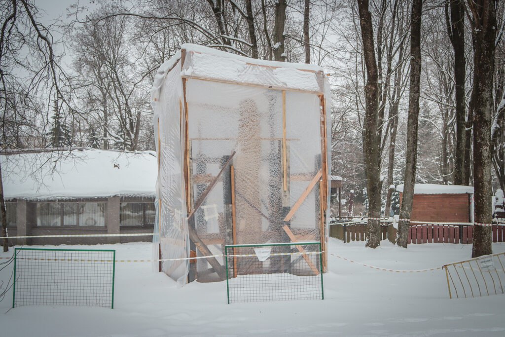 Скульптура Романа Брянского зимует на рабочей площадке недалеко от летней эстрады. От непогоды она укрыта защитной конструкцией. С приходом весны ее покроют специальным маслом с добавками, которые предотвращают гниение.
