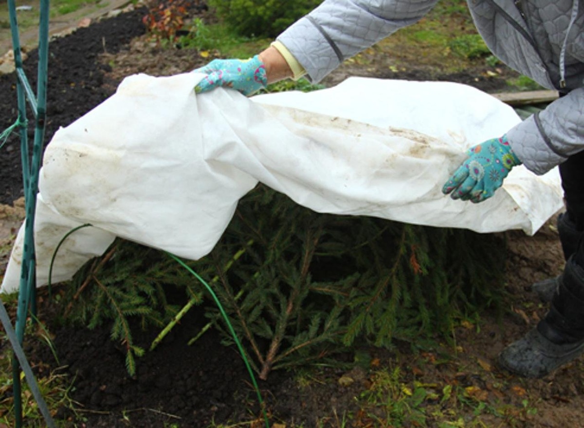 Еловый лапник идеально подходит как укрытие: он помогает удерживать снег и создает необходимую воздушную прослойку. Также подойдут высококачественные нетканые материалы, такие как спанбонд или лутрасил. Ни в коем случае не используйте опавшие листья, так как они могут содержать вредителей. Вместо этого омучьте основание куста сухим грунтом или компостом, но избегайте песка, который может образовать ледяные блоки.