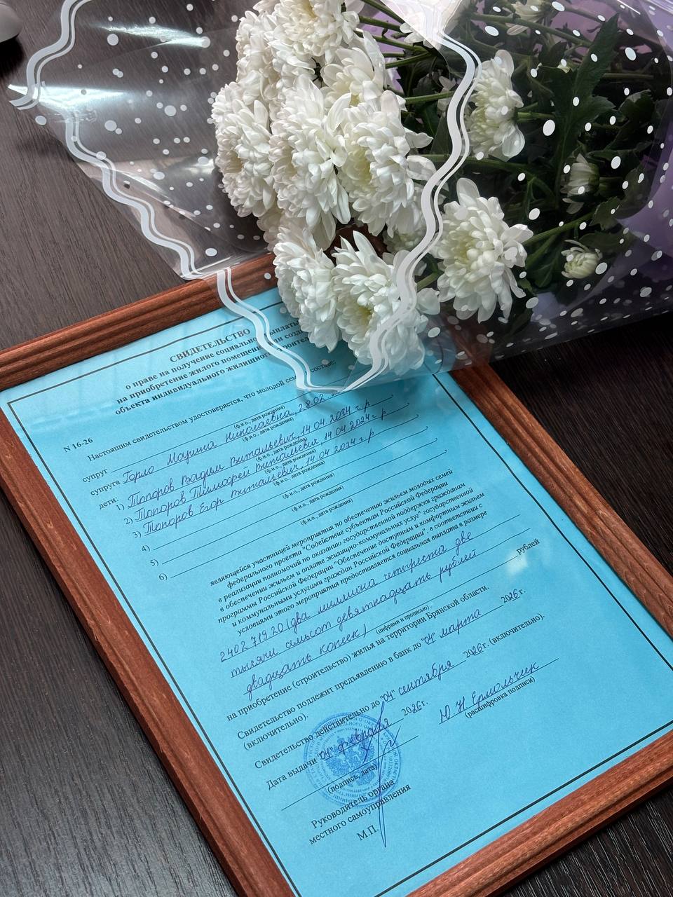 4 февраля 2026 года Марине Николаевне Горло, являющейся участницей мероприятия по обеспечению жильем молодых семей федерального проекта Содействие субъектам Российской Федерации в реализации полномочий по оказанию государственной поддержки гражданам в обеспечении жильем и оплате жилищно-коммунальных услуг государственной программы Российской Федерации Обеспечение доступным и комфортным жильем и коммунальными услугами граждан Российской Федерации, главой администрации Стародубского муниципального округа Александром Подольным вручено свидетельство о праве на получение социальной выплаты на приобретение жилого помещения или создание объекта индивидуального жилищного строительства на территории Брянской области.