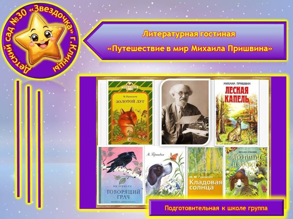 Чтобы расширить кругозор знаний и познакомить воспитанников с писателем Михаилом Пришвиным в МБДОУ – детский сад № 30 «Звёздочка» в подготовительной к школе группе прошло мероприятие Литературная гостиная «Путешествие в мир Михаила Пришвина». Воспитанники внимательно слушали рассказы: «Ребята и утята», «Кот», «Берестяная трубочка» и другие, познакомились с выставкой книг, где были представлены рассказы писателя, поиграли в экологическую викторину. Затем дети нарисовали рисунки к рассказам Михаила Пришвина.