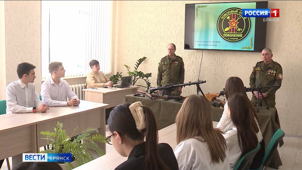 В рамках месячника оборонно-массовой работы в Брянском техникуме питания и торговли прошел урок мужества "По зову сердца, по зову памяти". В этом году в качестве лекторов выступили волонтеры поискового отряда "Поколение".