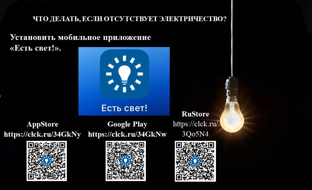 Установить приложение «Есть свет!» можно через магазин приложений мобильного устройства AppStore,GooglePlay, RuStore, перейдя по ссыке ниже или отсканировав QR-code: