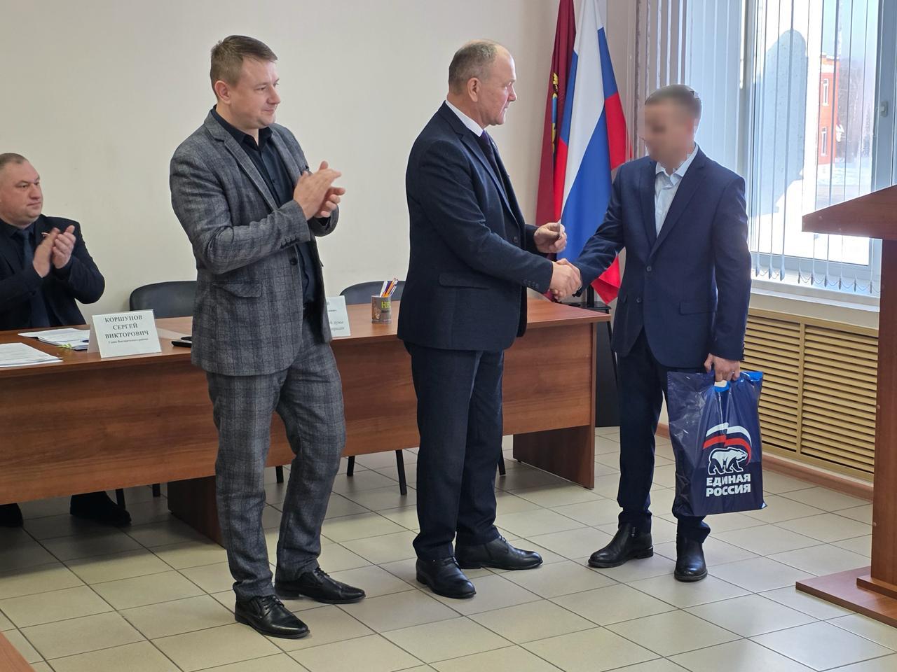 Далее принял участие в заседании Выгоничского районного Совета народных депутатов. Перед началом заседания вручил партийный билет всероссийской политической партии "ЕДИНАЯ РОССИЯ" участнику СВО, победителю региональной программы «Брянские Герои».
