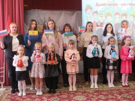 Ярким моментом торжественного мероприятия стал «Парад дружбы народов»: ребята вместе с взрослыми гордо пронесли флажки народов России и кукол в национальных костюмах.