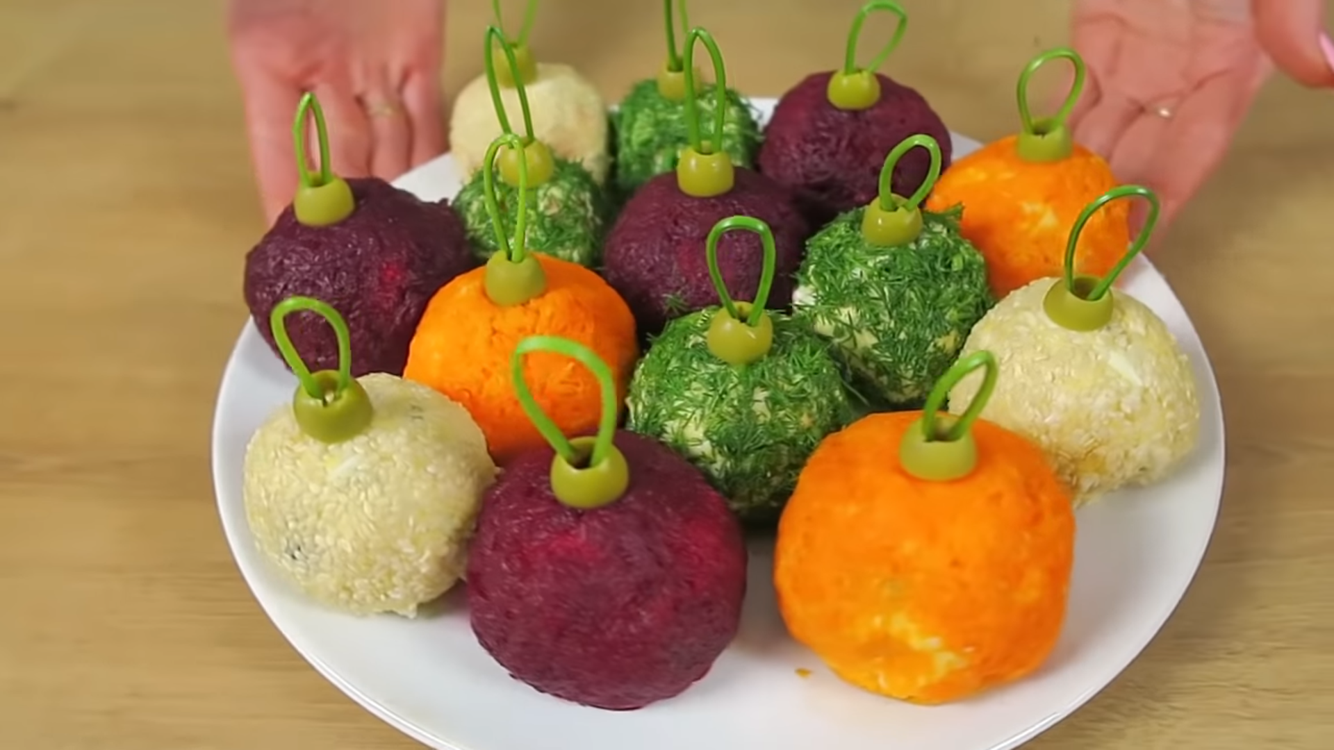 Скатайте «игрушки» из сырной массы и обваляйте в одной из заготовок. Сверху в каждый шарик воткните маслину, а в ее отверстие аккуратно поместите тонкий стебель укропа в форме петли. Теперь разноцветная закуска готова оказаться на столе, передает портал «Лайфхакер».