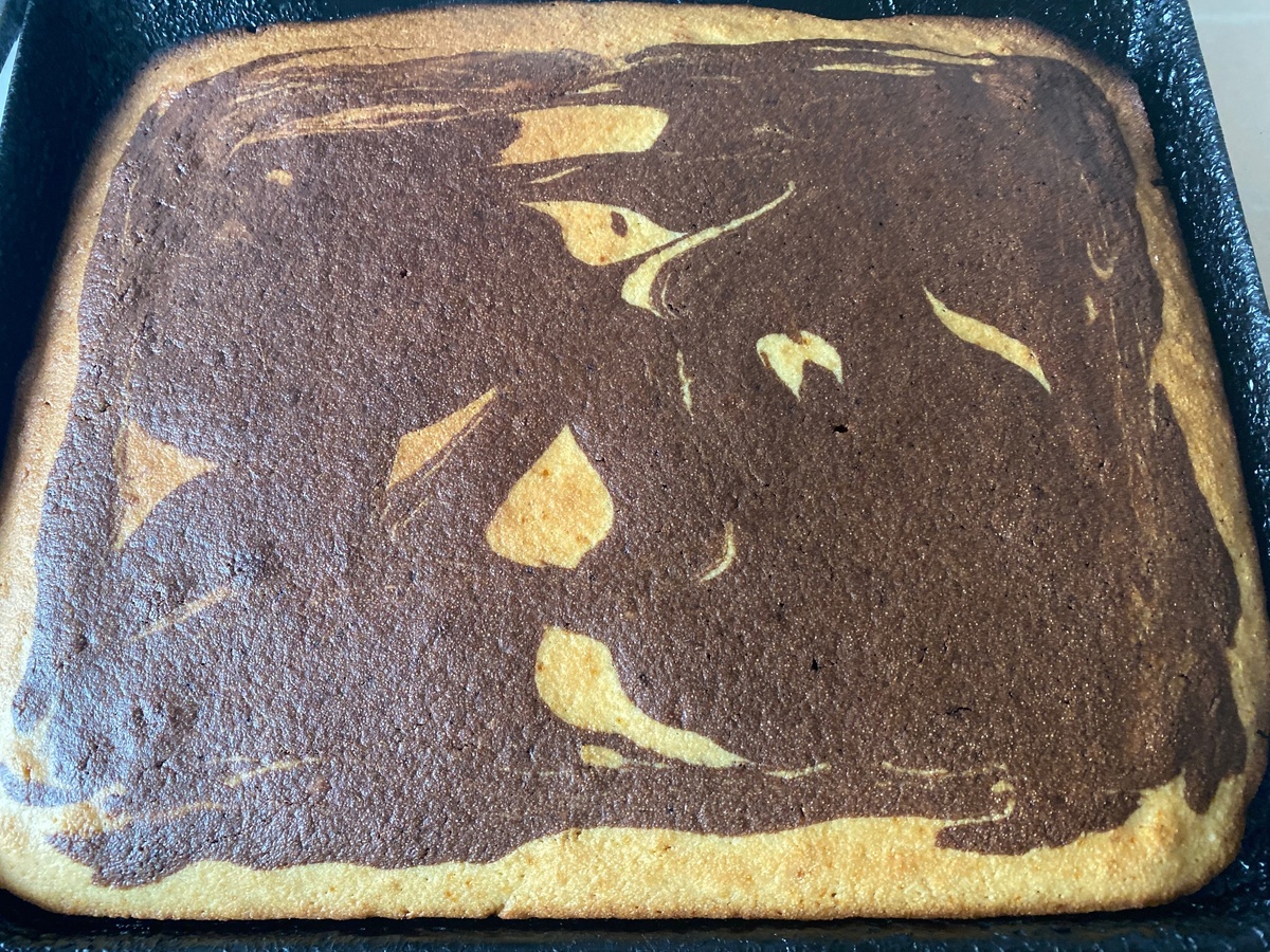 В подготовленный противень, смазанный растительным маслом, чередующимися слоями выкладывают белое и темное тесто, проводя по верхнему слою ложкой, создавая зебровый эффект.