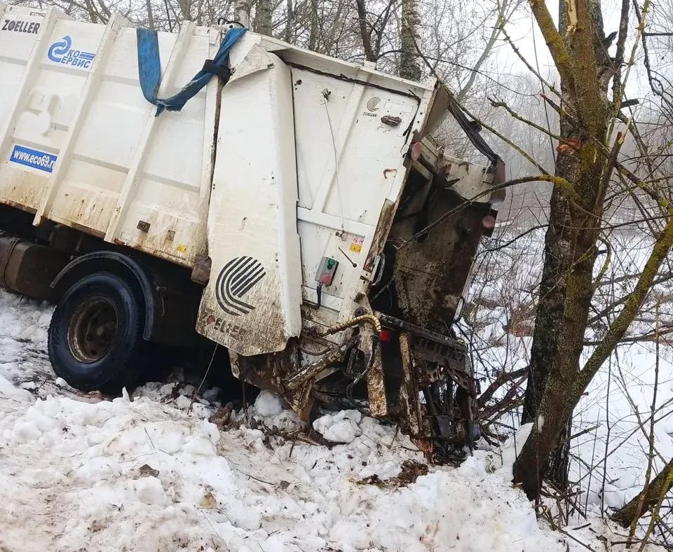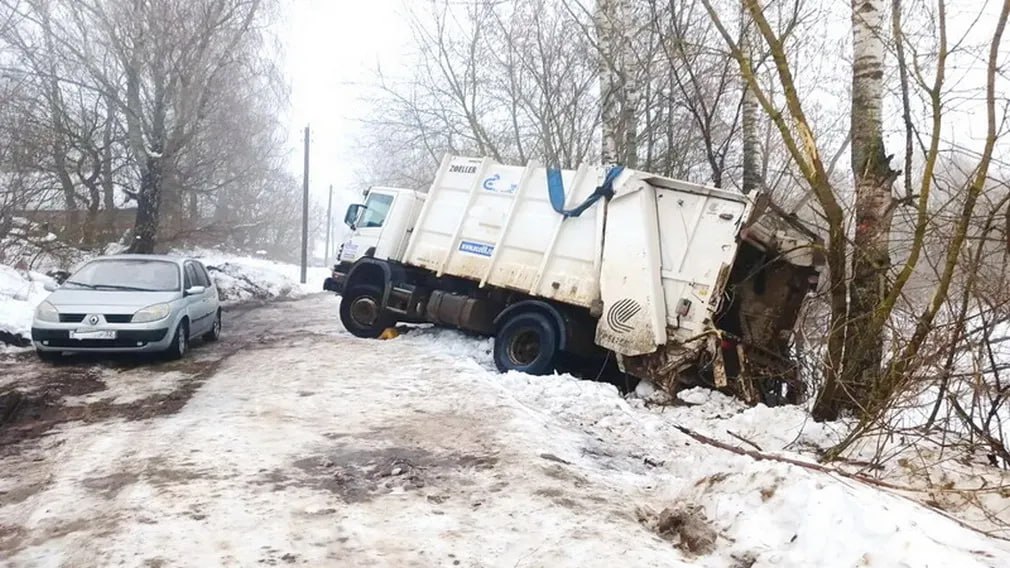 В Клинцовском районе Брянской области на скользкой дороге мусоровоз снесло в овраг. Вот уже сутки тяжелую технику никак не могут вытащить, сообщает пресс-служба регионального оператора по обращению с ТКО.