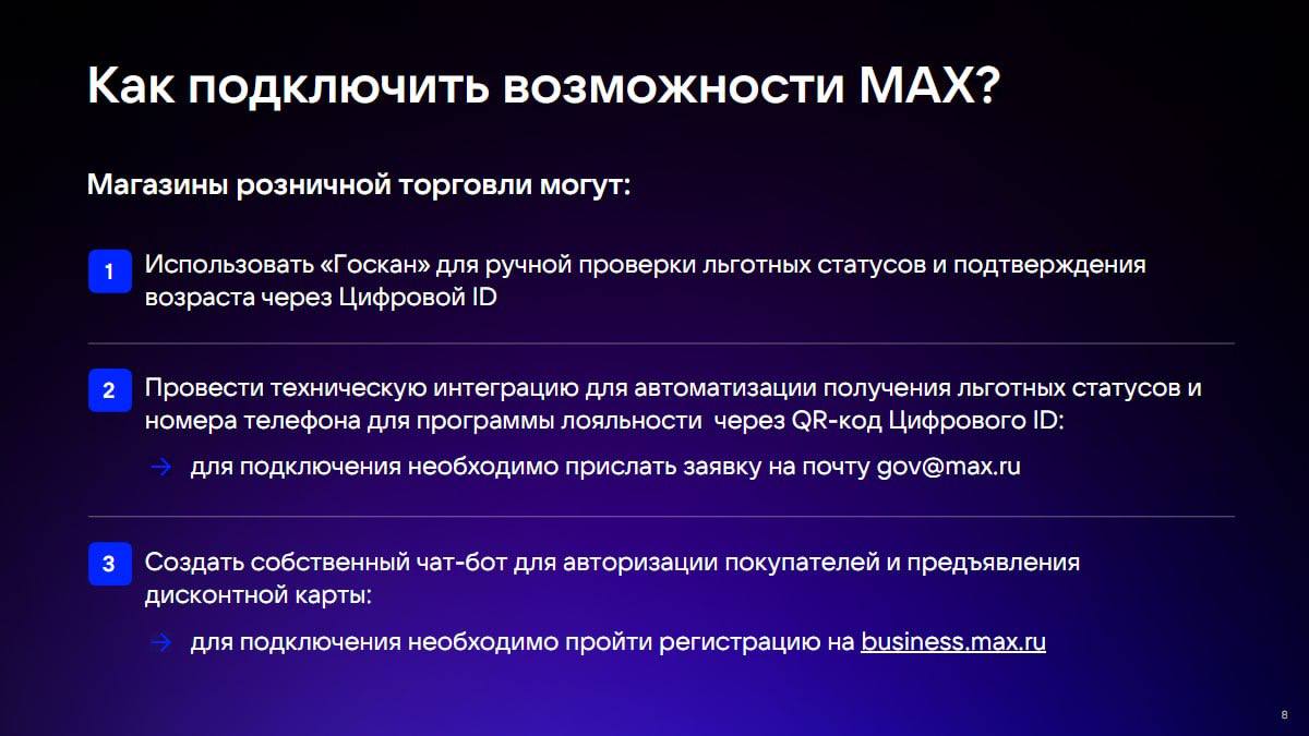 По поручению Минпромторга России в торговых объектах должно быть обеспечено использование сервиса Цифрового ID Max. Кроме того, Минпромторгом России в рамках исполнения поручения Председателя Правительства Российской Федерации М.В. Мишустина от 28 октября 2025 г. № ММ-П10-40556 о внедрении в розничной торговле многофункционального сервиса обмена информацией, а также протокола заседания Штаба потребительского рынка Минпромторга России от 29 октября 2025 г. № 126-ЧР136806/15 были направлены для исполнения ключевые показатели эффективности внедрения в розничной торговле национального мессенджера.