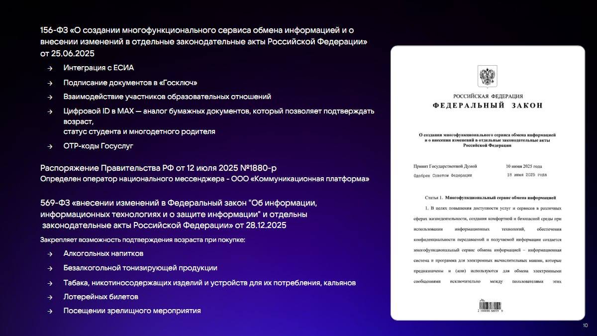 Федеральным законом от 24 июня 2025 года № 156-ФЗ «О создании многофункционального сервиса обмена информацией и о внесении изменений в отдельные законодательные акты Российской Федерации» предусмотрено использование сервиса Цифрового ID MAX для предоставления гражданами Российской Федерации сведений, содержащихся в документах, удостоверяющих личность гражданина Российской Федерации, либо иных документах, выданных государственными органами, органами местного самоуправления, организациями.