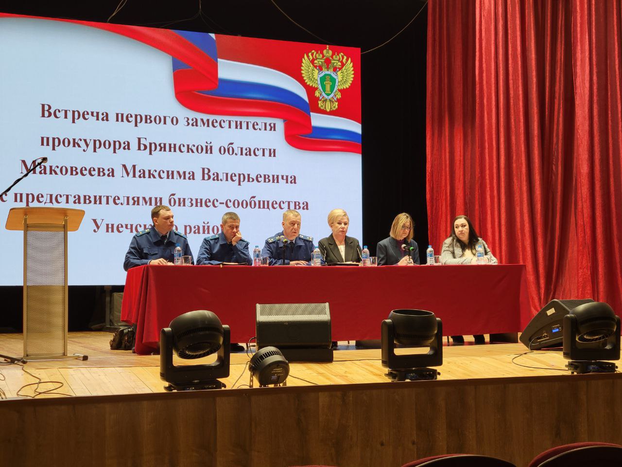 Сегодня под председательством Маковеева Максима Валерьевича -первого заместителя прокурора Брянской области состоялась рабочая встреча с представителями бизнес-сообщества Унечского района, в которой приняли участие:
