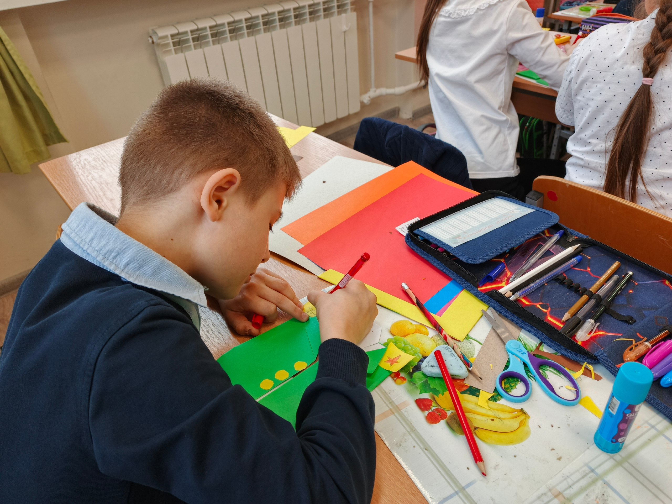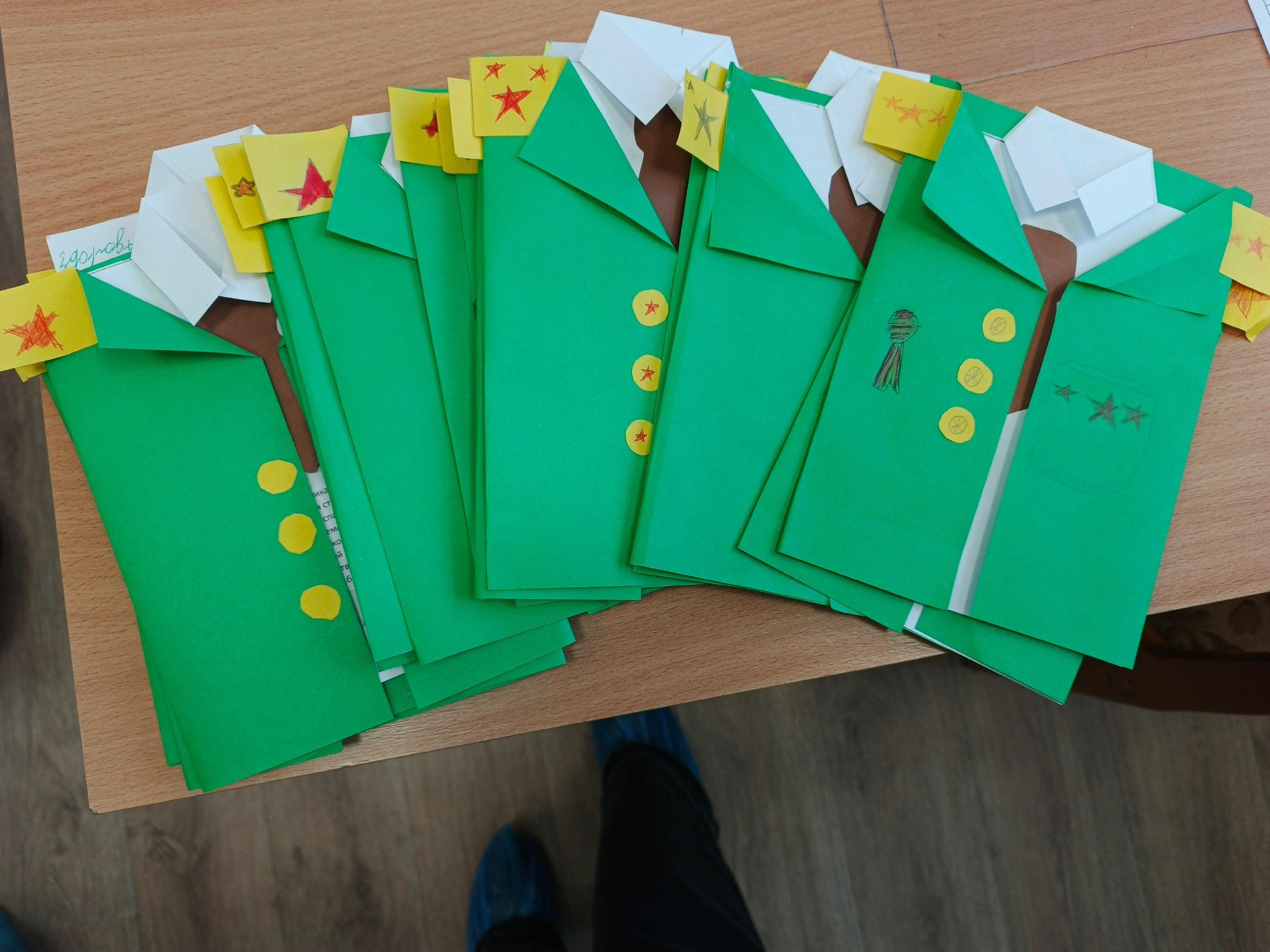 Ребятам раздали наборы для творчества и закипела работа: школьники ловко вырезали заготовки и вклеивали в готовую поделку, с особым азартом были нарисованы звезды на погонах и ордена на мундире.