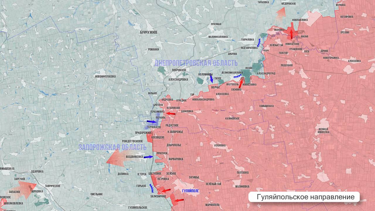 На Гуляйпольском участке ВС РФ широким фронтом продвигается от Гуляйпольского до Рождественского, подготовив плацдарм для уничтожения позиций ВСУ в районе Горького, а также сформировав южный охват Верхней Терсы. Ночью уничтожены штурмовые группы ВСУ в районе Бойково и Риздвянки. Пока украинские ресурсы разгоняют слухи о возвращении контроля над 300 км, армия России продолжает на этом участке продвигаться на запад и северо-запад от Гуляйполя. Стабилизируется ситуация на севере участка. Наши бойцы зачищают подконтрольные территории после прорыва ВСУ.