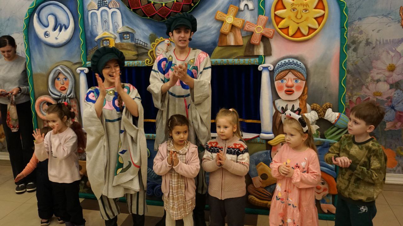 В спектакле «По щучьему велению» (0+) рассказывается хорошо известная всем история про Емелю, сказочное представление обрамляют сцены проводов зимы и встречи весны. Постановке режиссёра Павла Акинина и художника Светланы Долгиной уже больше десяти лет, она нравится, как зрителям, так и артистам своим праздничным задором и добрым юмором. Вот и в этот день на сцене царило веселье, которое передавалось в зрительный зал. А в фойе детей и взрослых уже ждало угощение.