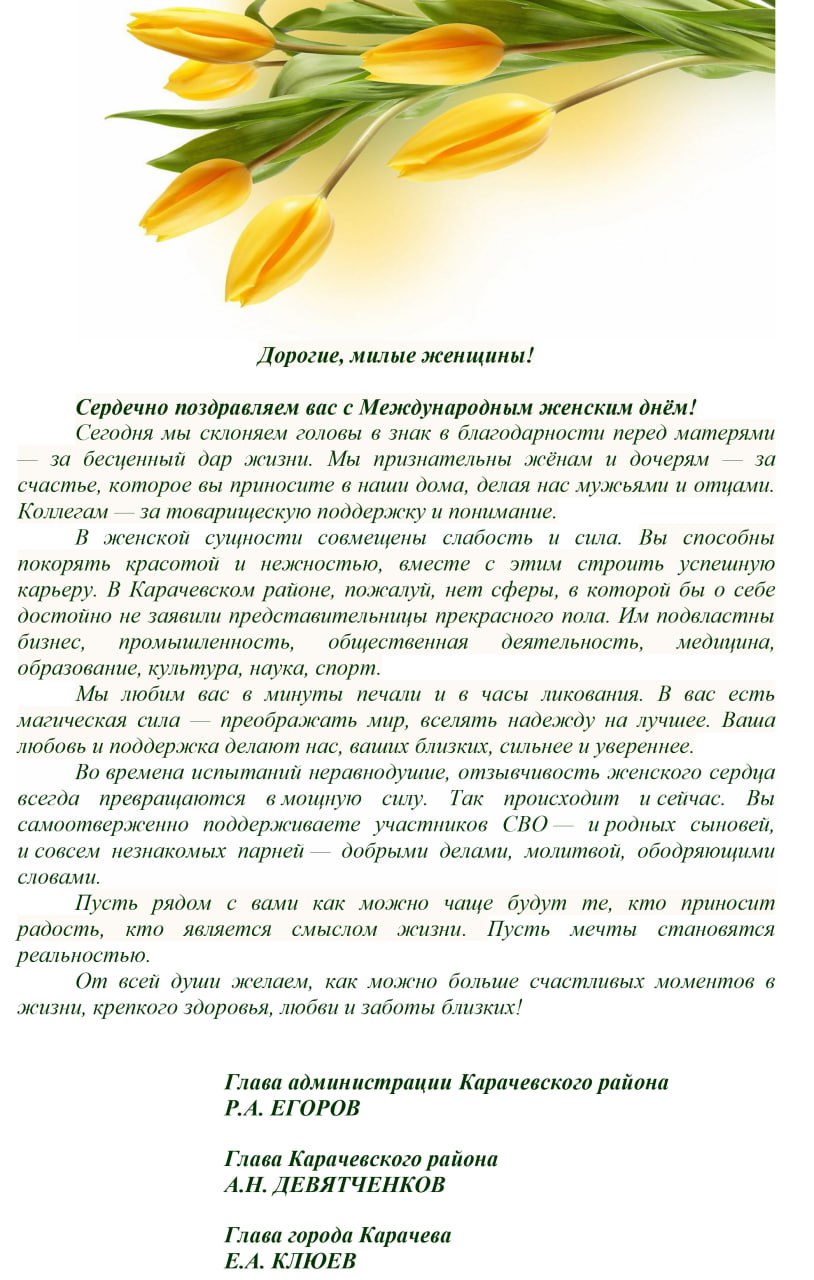 В женской сущности совмещены слабость и сила. Вы способны покорять красотой и нежностью, вместе с этим строить успешную карьеру. В Карачевском районе, пожалуй, нет сферы, в которой бы о себе достойно не заявили представительницы прекрасного пола. Им подвластны бизнес, промышленность, общественная деятельность, медицина, образование, культура, наука, спорт.