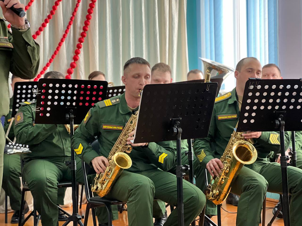 Настоящей изюминкой вечера стало выступление духового оркестра войсковой части № 42685. Музыкальные номера в их исполнении наполнили зал особой торжественностью и теплом, создав неповторимую атмосферу праздника.