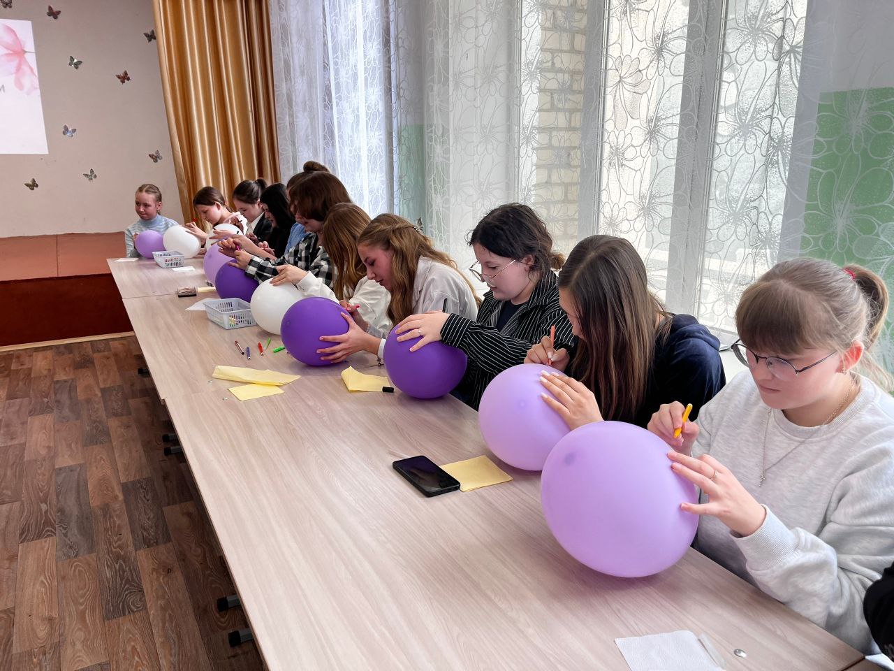 «Самая обаятельная» — юные художницы на скорость создавали портрет весенней красавицы с помощью фломастера и воздушного шарика.