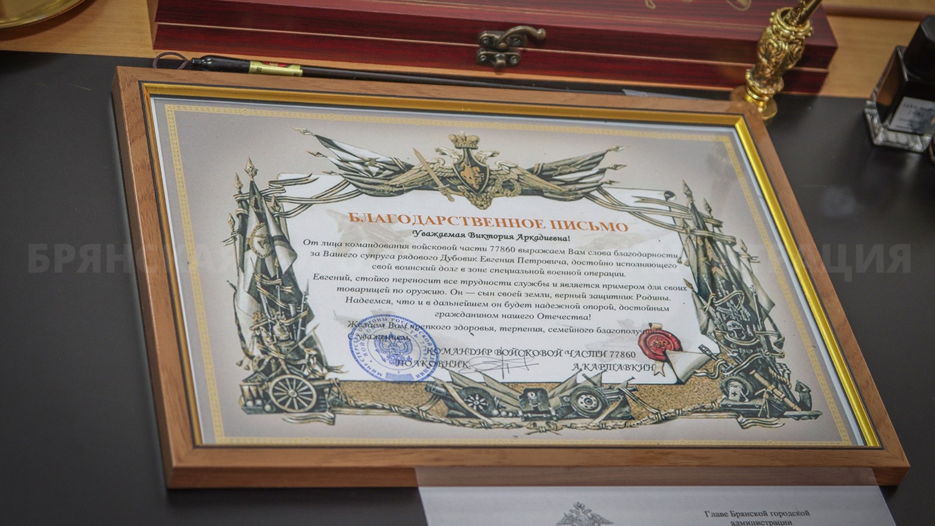 Брянской семье участника СВО вручили благодарственное письмо от командования части