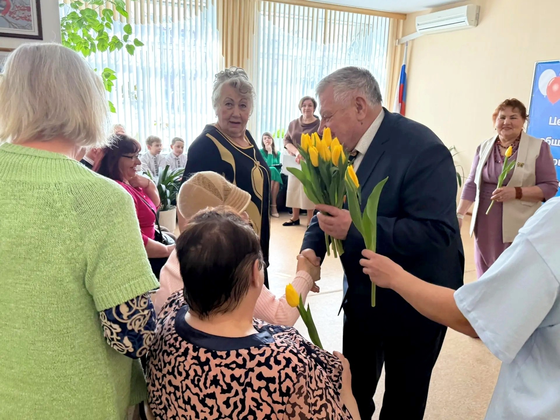 Директор ГБУ КЦСОН Унечского района, Алексей Михайлович Семенихин, обратился к присутствующим женщинам с проникновенными словами признательности. Он от души поздравил членов клуба "Активное долголетие" с наступающим праздником, отметив их неувядающую энергию, мудрость и активную жизненную позицию. В знак особого внимания и уважения Алексей Михайлович вручил каждой женщине яркие тюльпаны – традиционный и всеми любимый символ Международного женского Дня 8 Марта.