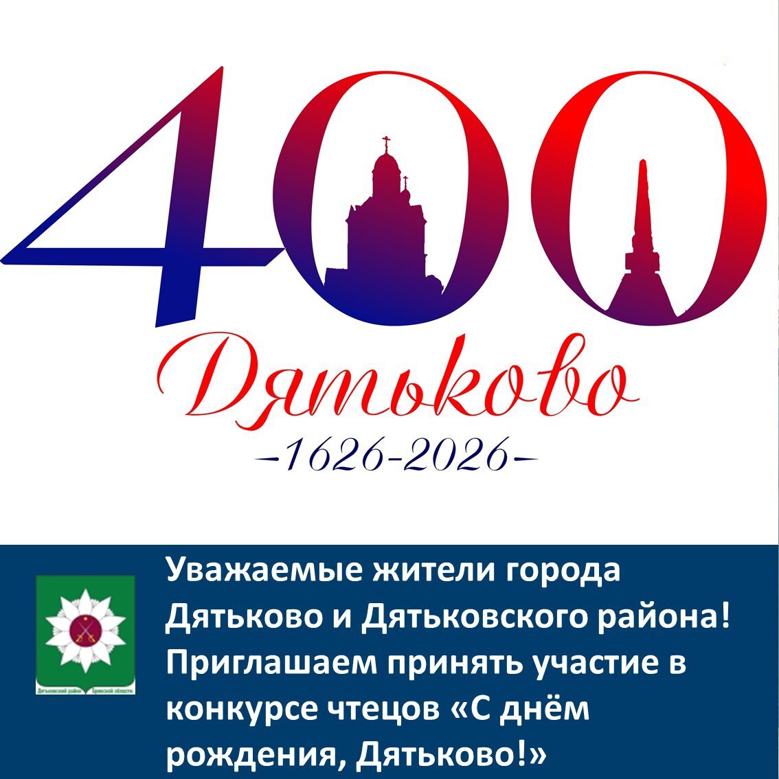 Приглашаем всех желающих принять участие в городском конкурсе чтецов «С днём рождения, Дятьково!», посвящённого 400-летию основания города Дятьково. Положение о конкурсе и форма заявки прилагается.