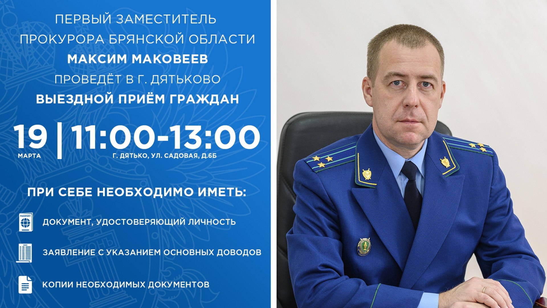 Первый заместитель прокурора Брянской области Максим Маковеев проведет выездной прием граждан в Дятьково. С людьми представитель надзорного ведомства встретится 19 марта.