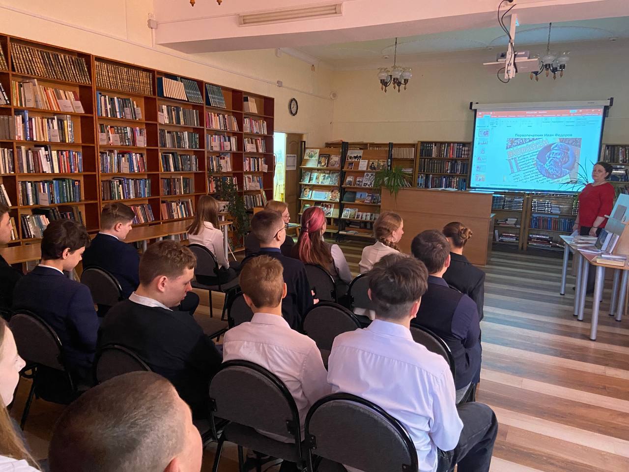 Старшеклассники совершили виртуальное путешествие в далёкую Древнюю Русь и познакомились с историей появления первой печатной книги «Апостол», послушали рассказ о жизни и деяниях первопечатника Ивана Фёдорова. Вниманию школьников был представлен обзор книжной выставки «Живое слово мудрости духовной».
