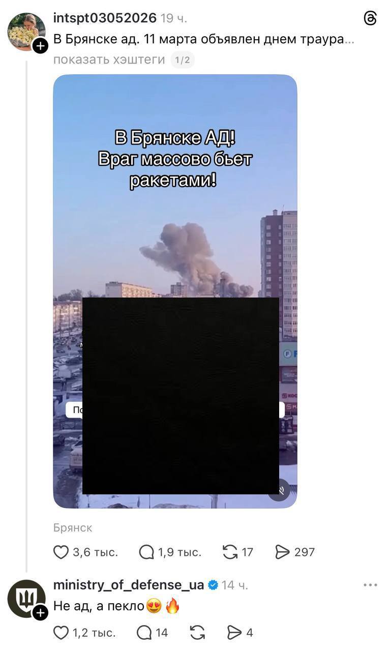 Официальный аккаунт Минобороны Украины постит издевательские комменты после удара по Брянску