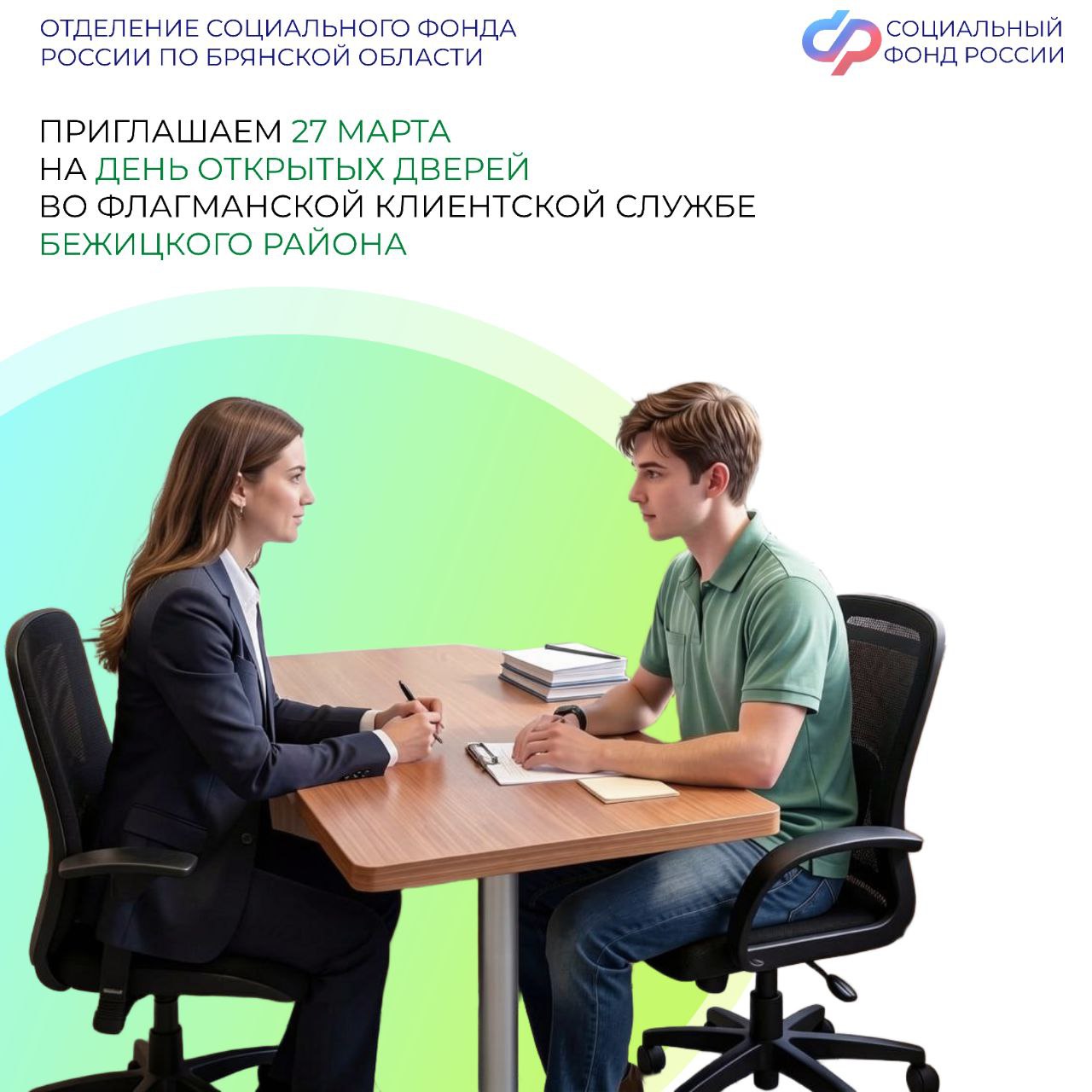Отделение Социального фонда России по Брянской области приглашает всех желающих на День открытых дверей. Мероприятие начнется 27 марта в 11:00 часов во флагманской Клиентской службе Бежицкого района по адресу: г. Брянск, ул. Комсомольская, д. 2.