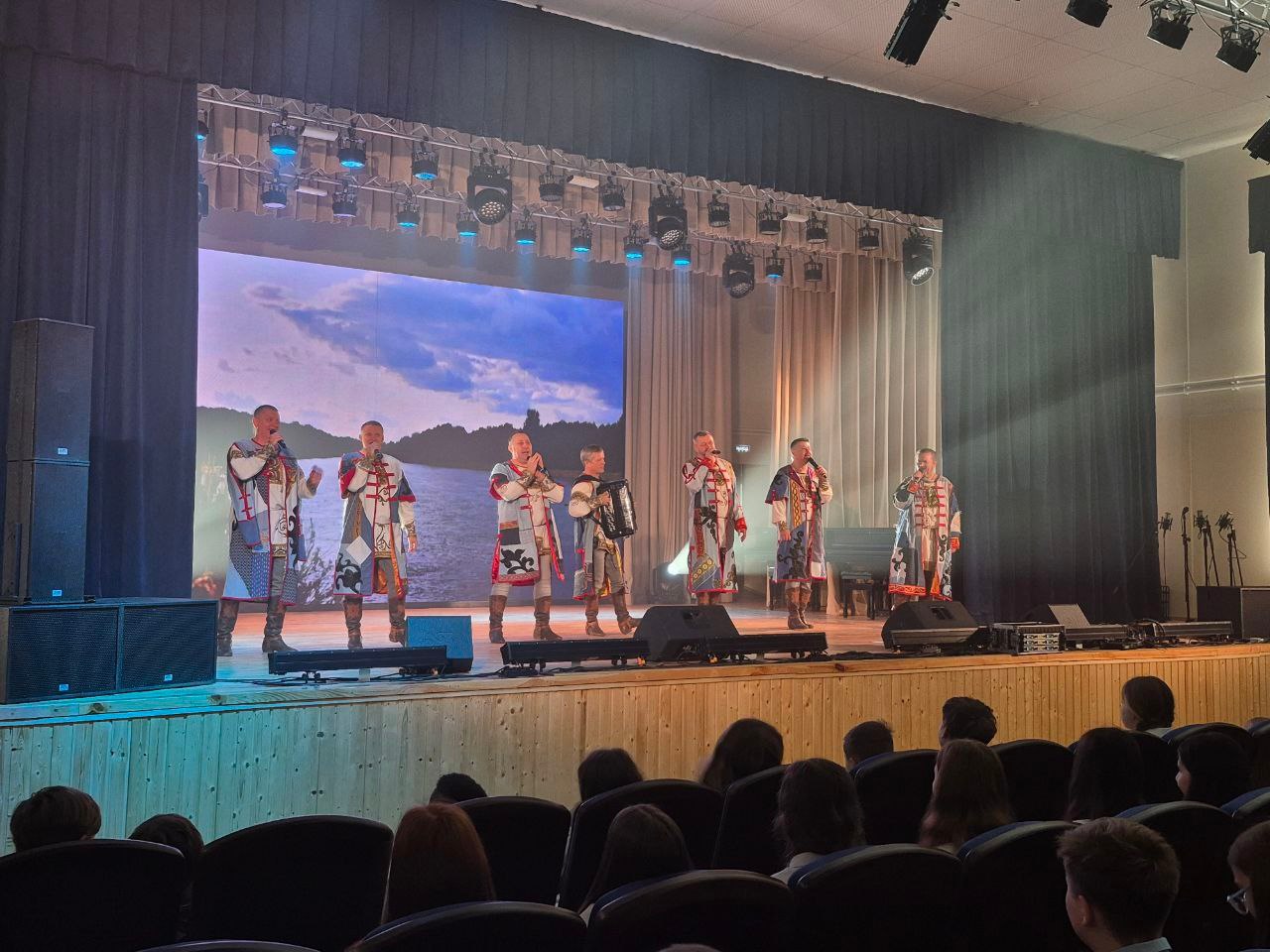 Артисты Брянской областной филармонии выступили для учащихся СОШ №4 в рамках урока музыки из цикла "Гармония". Ансамбль народной музыки «Ватага» представил программу «Дым Отечества».