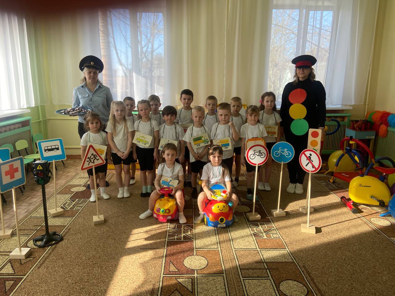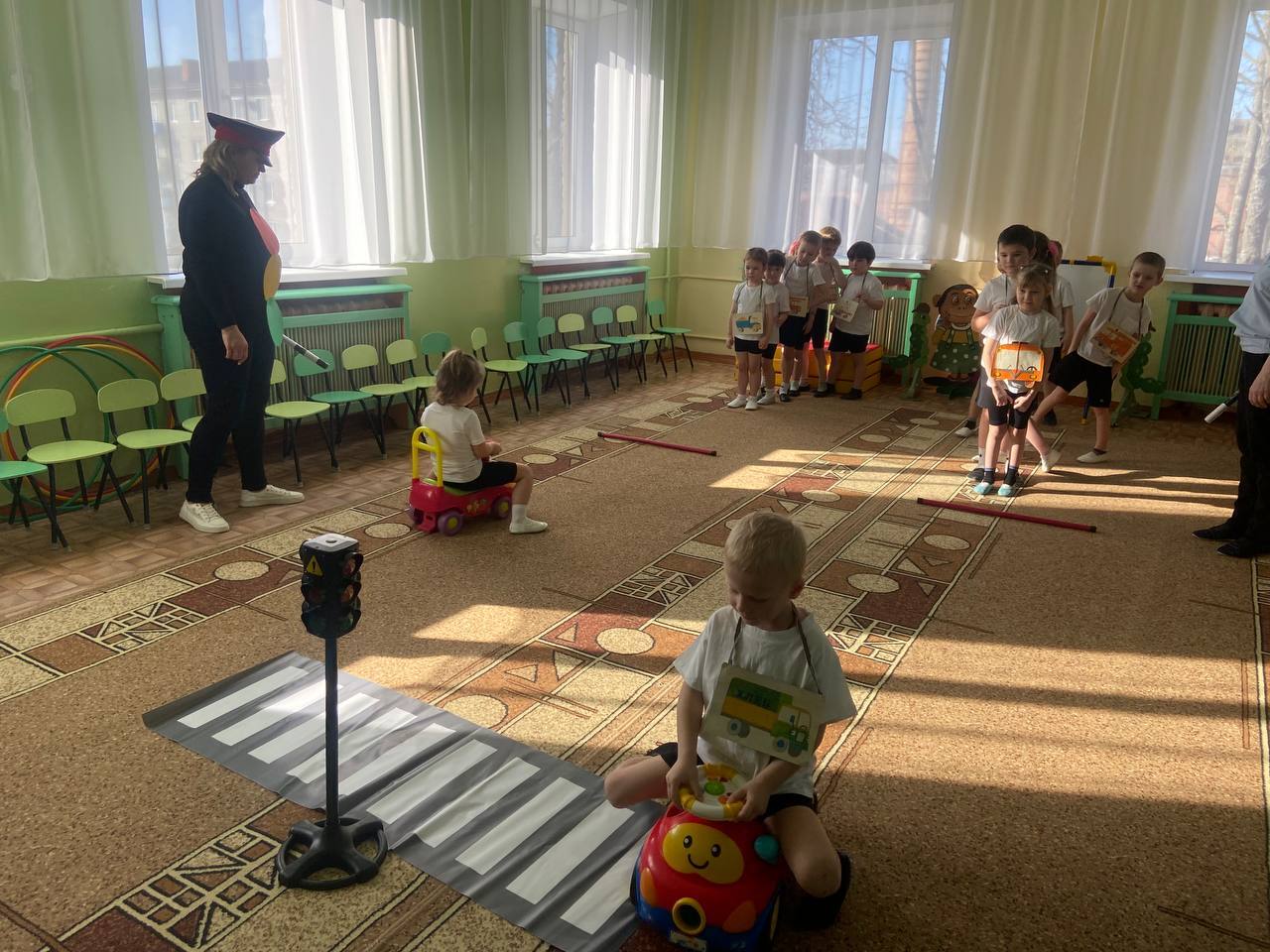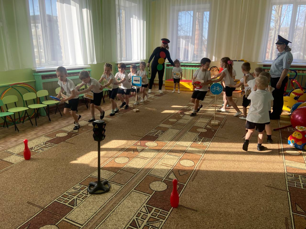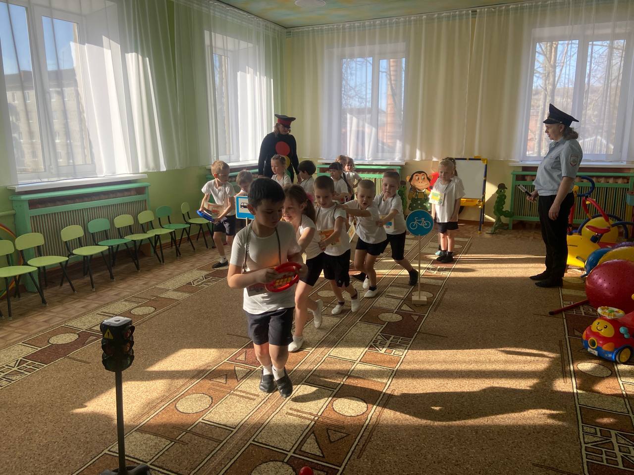 Воспитанники старшего дошкольного возраста играли в игры «Красный, жёлтый и зелёный», участвовали в эстафетах «Внимательный водитель», «Цветные рули» и др., отгадывали загадки о дорожных знаках.