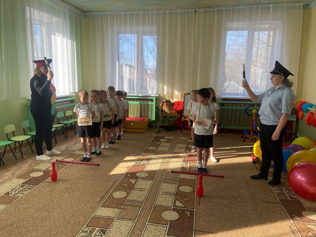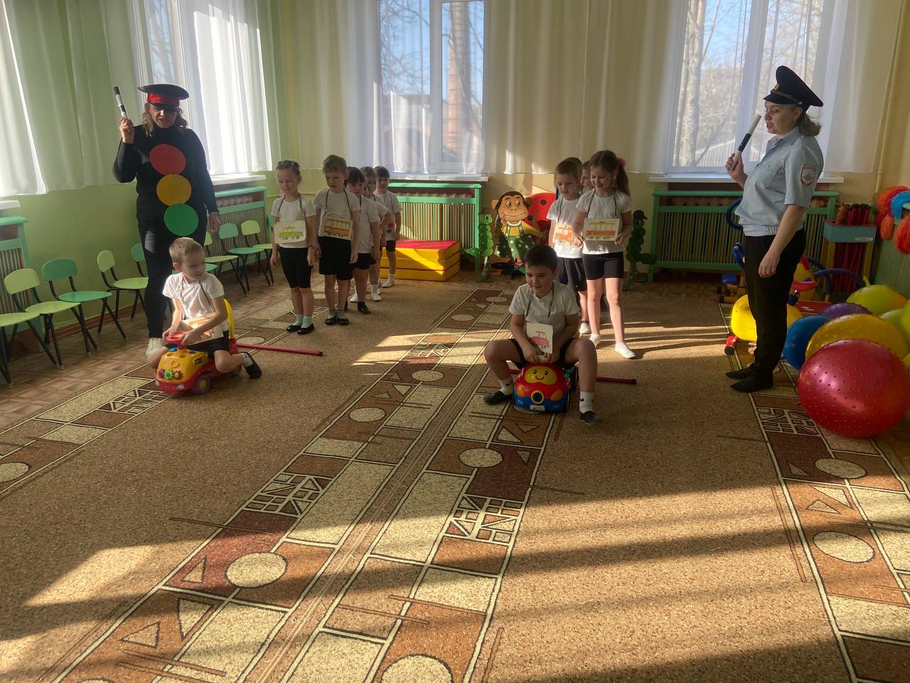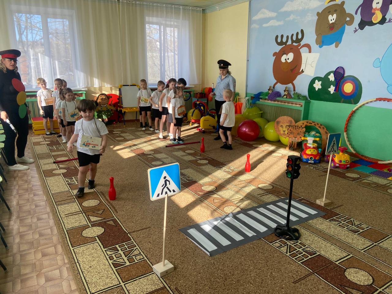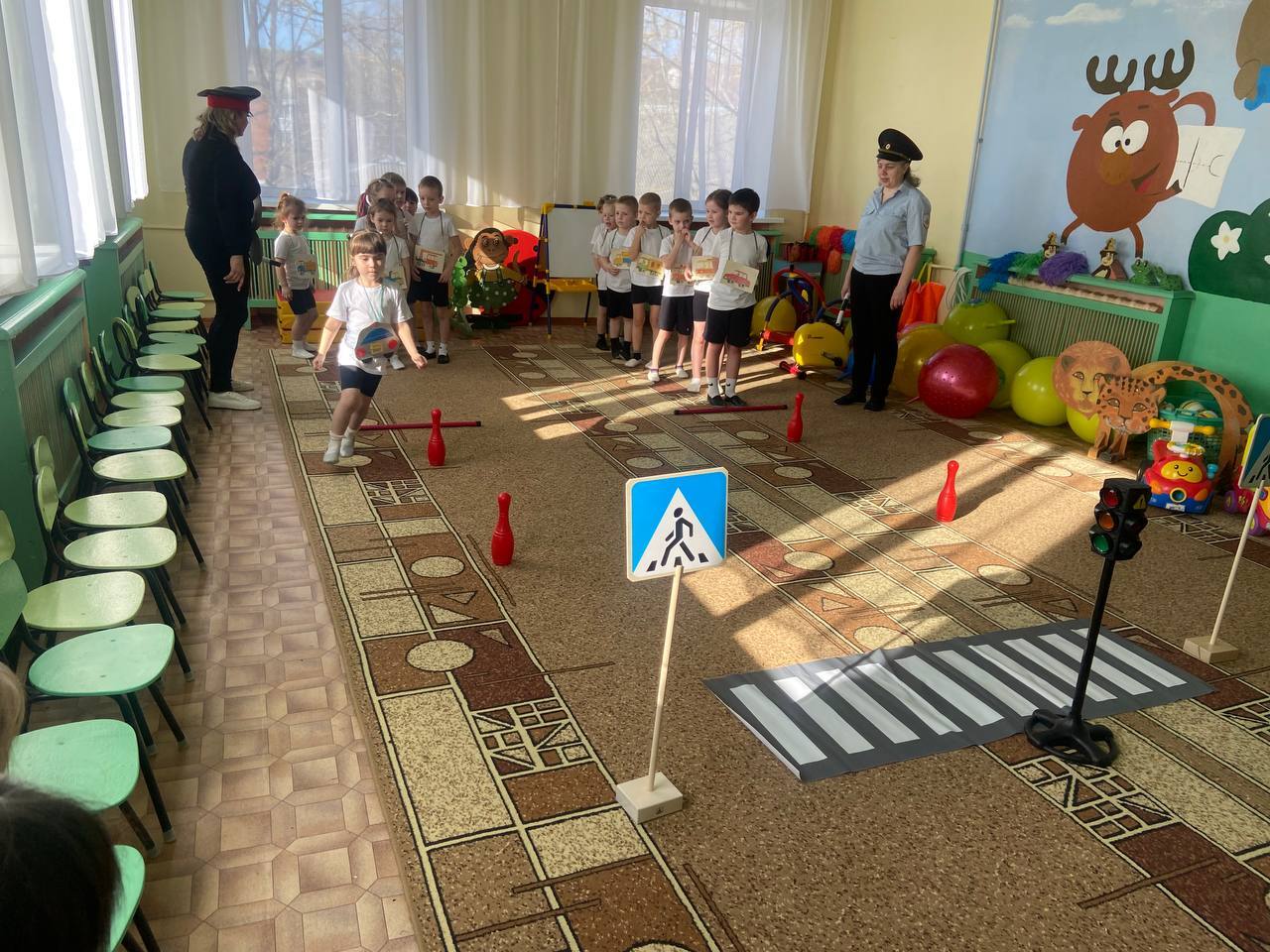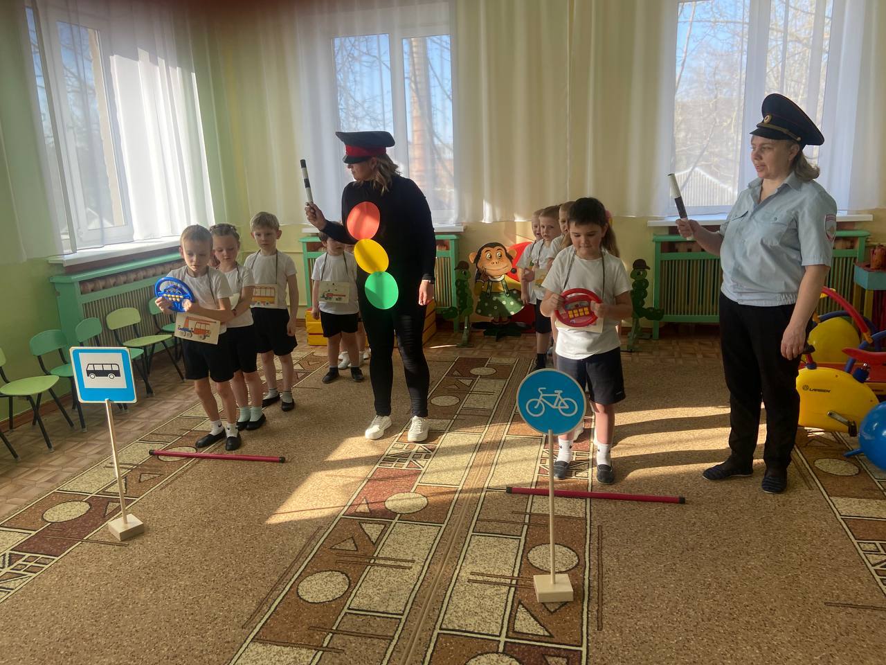 Воспитанники старшего дошкольного возраста играли в игры «Красный, жёлтый и зелёный», участвовали в эстафетах «Внимательный водитель», «Цветные рули» и др., отгадывали загадки о дорожных знаках.