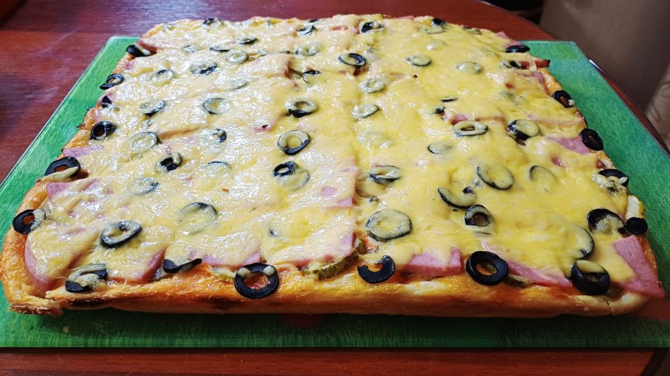 Затем нарезаем маринованные огурцы кружочками и добавляем их на пиццу. Дальше идет вареная колбаса, которую нужно нарезать четверть кольцами, и немного оливок. Завершает процесс натертый на крупной тёрке сыр — он сделает блюдо особенно нежным и вкусным.